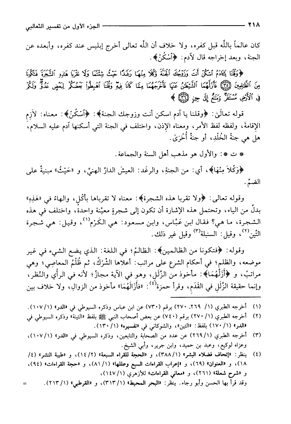 قوله تعالى: وَقُلْنا يا آدَمُ اسْكُنْ أَنْتَ وَزَوْجُكَ الْجَنَّةَ: اسْكُنْ: معناه: لاَزِمِ الإقامةَ، ولفظه لفظ الأمر، ومعناه الإِذن، واختلف في الجنة التي أسكنها آدم عليه السلام، هل هي جنةُ الخُلْدِ، أو جنةٌ أخرى.