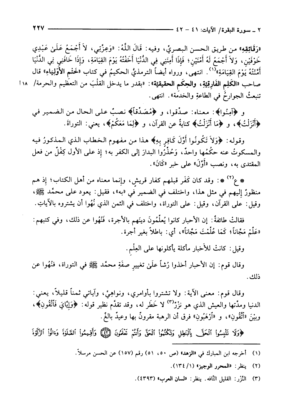 وقال قوم: إن الأحبار أخذوا رُشاً على تغييرِ صفَةِ محمَّد صلّى الله عليه وسلم في التوراة، فنُهُوا عن ذلك.