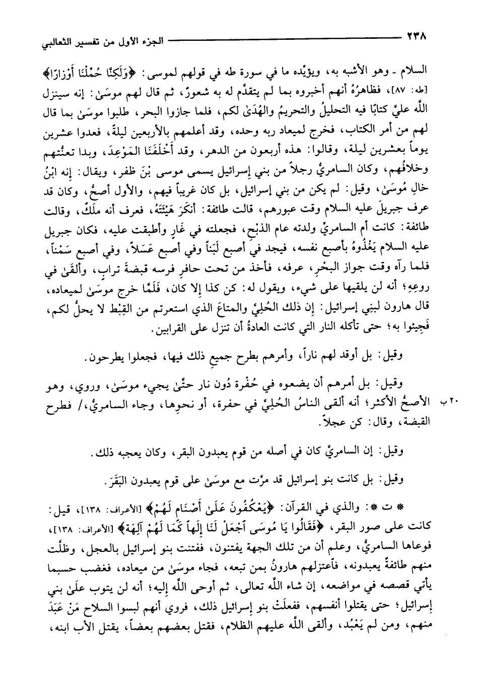السلام- وهو الأشبه به، ويؤيِّده ما في سورة طه في قولهم لموسى: وَلكِنَّا حُمِّلْنا أَوْزاراً [طه: 87] ، فظاهرُهُ أنهم أخبروه بما لم يتقدَّم له به شعورٌ، ثم قال لهم موسى: إنه سينزل اللَّه عليَّ كتابًا فيه التحليلُ والتحريمُ والهدى لكم، فلما جازوا البحر، طلبوا موسى بما قال لهم من أمر الكتاب، فخرج لميعاد ربه وحده، وقد أعلمهم بالأربعين ليلةً، فعدوا عشرين يوماً بعشرين ليلة، وقالوا: هذه أربعون من الدهر، وقد أَخْلَفَنَا المَوْعِدَ، وبدا تعنُّتهم وخلافُهم، وكان السامريُّ رجلاً من بني إسرائيل يسمى موسى بْنَ ظفر، ويقال: إِنه ابْنُ خالِ موسى، وقيل: لم يكن من بني إسرائيل، بل كان غريباً فيهم، والأول أصحُّ، وكان قد عرف جبريلَ عليه السلام وقت عبورهم، قالت طائفة: أنكَرَ هَيْئَتَهُ، فعرف أنه ملَكٌ، وقالت طائفة: كانت أم السامريِّ ولدته عام الذبْحِ، فجعلته في غَارٍ وأطبقت عليه، فكان جبريل عليه السلام يَغْذُوهُ بأصبع نفسه، فيجد في أصبع لَبَناً وفي أصبع عَسَلاً، وفي أصبع سَمْناً، فلما رآه وقت جواز البحْرِ، عرفه، فأخذ من تحت حافرِ فرسه قبضةَ ترابٍ، وألقى في روعِهِ أنه لن يلقيها على شيء، ويقول له: كن كذا إلا كان، فَلَمَّا خرج موسى لميعاده، قال هارون لبنِي إسرائيل: إِن ذلك الحُلِيَّ والمتاعَ الذي استعرتم من القِبْط لا يحلُّ لكم، فَجِيئوا به حتى تأكله النار التي كانت العادةُ أن تنزل على القرابين.