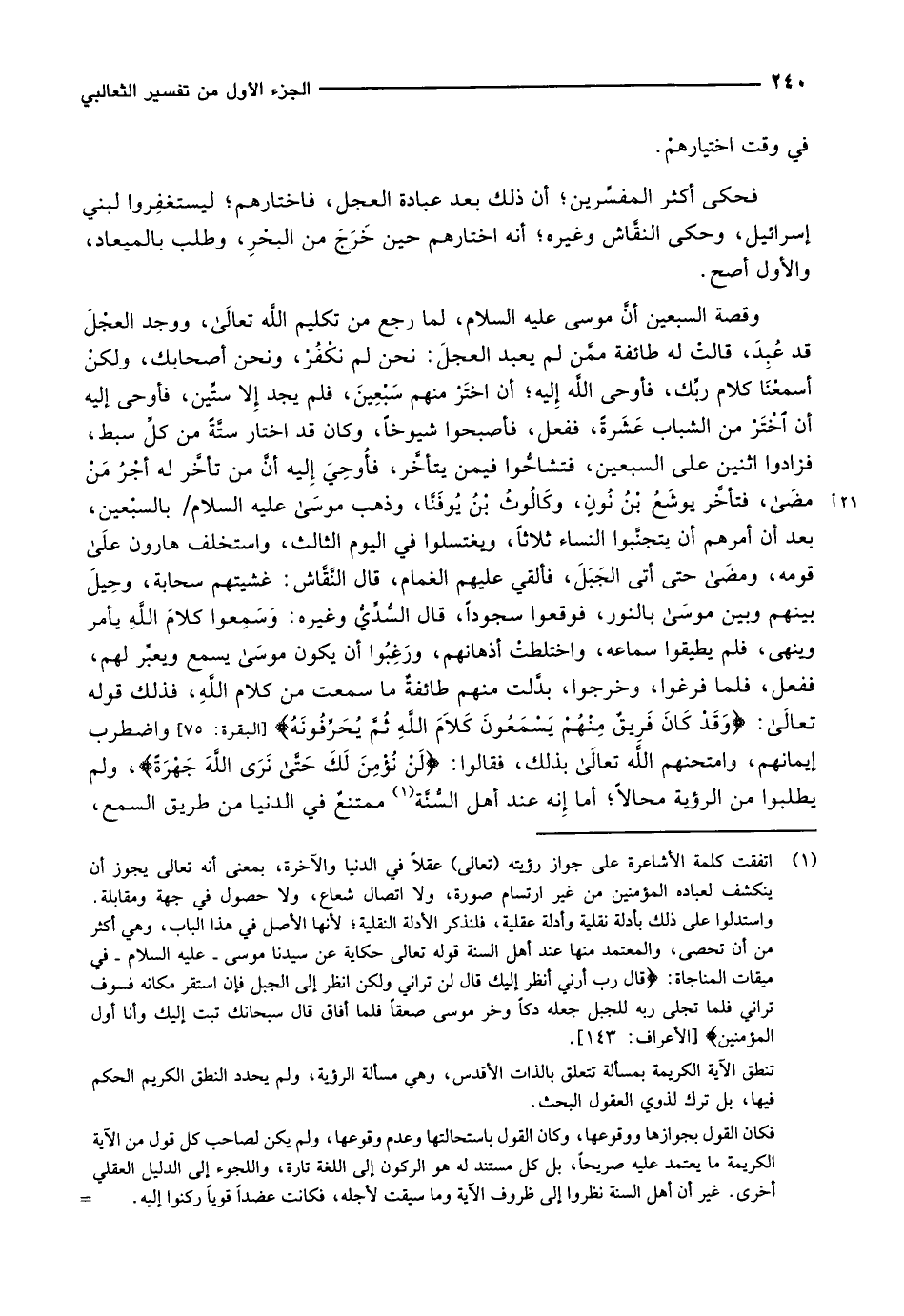 وقصة السبعين أنَّ موسى عليه السلام، لما رجع من تكليم اللَّه تعالى، ووجد العجْلَ قد عُبِدَ، قالتْ له طائفة ممَّن لم يعبد العجلَ: نحن لم نكْفُرْ، ونحن أصحابك، ولكنْ أسمعْنَا كلام ربِّك، فأوحى اللَّه إِليه أن اختَرْ منهم سَبْعِينَ، فلم يجد إلا ستِّين، فأوحى إليه أن اختر من الشباب عَشَرةً، ففعل، فأصبحوا شيوخاً، وكان قد اختار ستَّةً من كلِّ سبط، فزادوا اثنين على السبعين، فتشاحُّوا فيمن يتأخَّر، فأُوحِيَ إِليه أنَّ من تأخّر له أجر من 21 أمضى، فتأخَّر يوشَعُ بْنُ نُونٍ، وكَالُوثُ بْنُ يُوفَنَّا، وذهب موسى عليه السلام/ بالسبْعين، بعد أن أمرهم أن يتجنَّبوا النساء ثلاثاً، ويغتسلوا في اليوم الثالث، واستخلف هارون على قومه، ومضى حتى أتى الجَبَلَ، فألقي عليهم الغمام، قال النَّقَّاش: غشيتهم سحابة، وحِيلَ بينهم وبين موسى بالنور، فوقعوا سجوداً، قال السُّدِّيُّ وغيره: وَسَمِعوا كلامَ اللَّهِ يأمر وينهى، فلم يطيقوا سماعه، واختلطتْ أذهانهم، ورَغِبُوا أن يكون موسى يسمع ويعبِّر لهم، ففعل، فلما فرغوا، وخرجوا، بدَّلت منهم طائفةٌ ما سمعت من كلام اللَّهِ، فذلك قوله تعالى: وَقَدْ كانَ فَرِيقٌ مِنْهُمْ يَسْمَعُونَ كَلامَ اللَّهِ ثُمَّ يُحَرِّفُونَهُ [البقرة: 75] واضطرب إيمانهم، وامتحنهم اللَّه تعالى بذلك، فقالوا: لَنْ نُؤْمِنَ لَكَ حَتَّى نَرَى اللَّهَ جَهْرَةً، ولم يطلبوا من الرؤية محالاً أما إِنه عند أهل السُّنَّة «1» ممتنعٌ في الدنيا من طريق السمع،