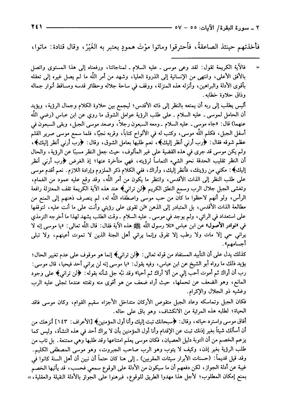 رب أن أراك ثم أموت أحب إلي من ألا أراك ثم أحيا» وقد نبّه جل شأنه بقوله: لَنْ تَرانِي على وجود المانع، وهو الضعف عن تحملها، حيث أراه ضعف من هو أقوى منه وتفتته عند ما تجلى عليه الرب وغشيه ذو الجلال والإكرام.