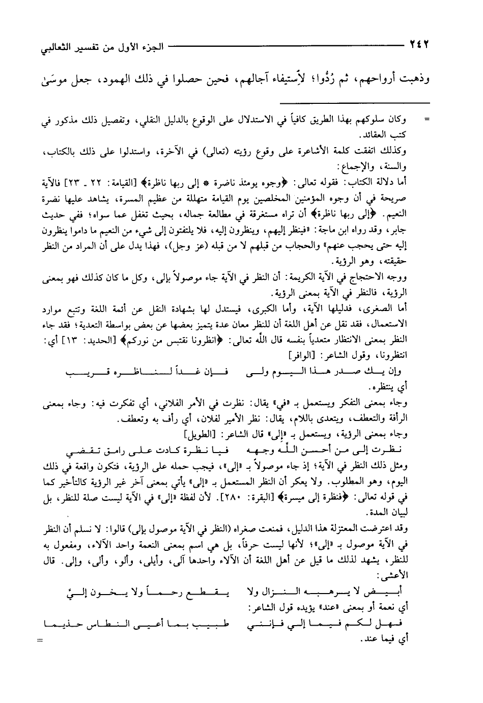 ومثل ذلك النظر في الآية إذ جاء موصولا ب «إلى» ، فيجب حمله على الرؤية، فتكون واقعة في ذلك اليوم، وهو المطلوب. ولا يعكر أن النظر المستعمل ب «إلى» يأتي بمعنى آخر غير الرؤية كالتأخير كما في قوله تعالى: فَنَظِرَةٌ إِلى مَيْسَرَةٍ [البقرة: 280] . لأن لفظة «إلى» في الآية ليست صلة للنظر، بل لبيان المدة.