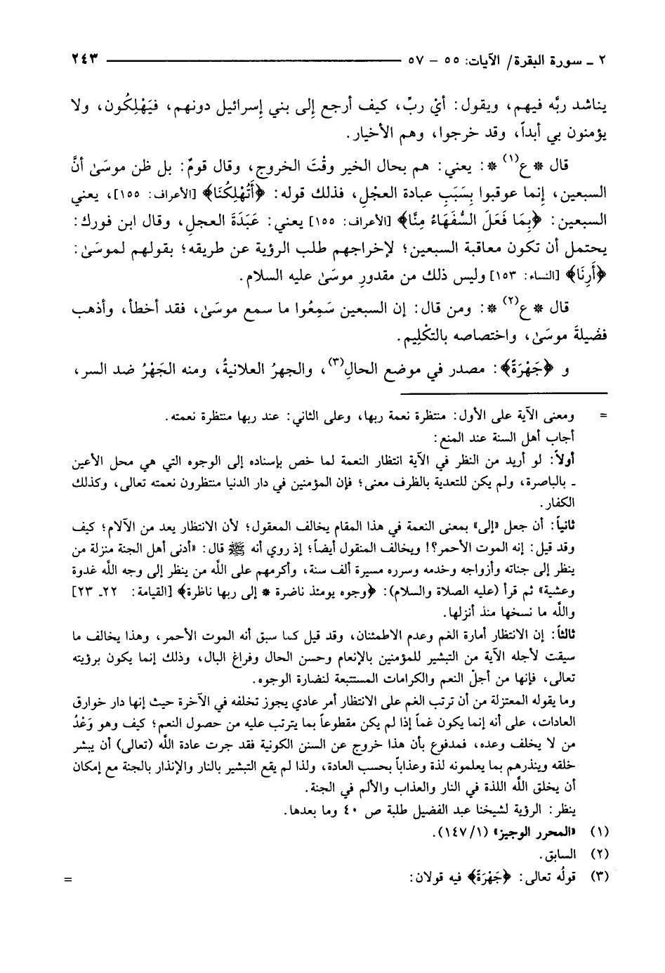 ثانيا: أن جعل «إلى» بمعنى النعمة في هذا المقام يخالف المعقول لأن الانتظار يعد من الآلام كيف وقد قيل: إنه الموت الأحمر؟! ويخالف المنقول أيضا إذ روي أنه صلّى الله عليه وسلم قال: «أدنى أهل الجنة منزلة من ينظر إلى جناته وأزواجه وخدمه وسرره مسيرة ألف سنة، وأكرمهم على الله من ينظر إلى وجه الله غدوة وعشية» ثم قرأ (عليه الصلاة والسلام) : وُجُوهٌ يَوْمَئِذٍ ناضِرَةٌ إِلى رَبِّها ناظِرَةٌ [القيامة: 22- 23] والله ما نسخها منذ أنزلها.