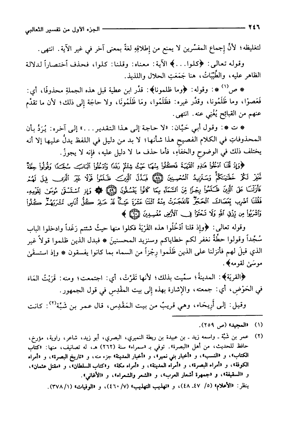 (2) عمر بن شبّة- واسمه زيد- بن عبيدة بن ريطة النميري، البصري، أبو زيد، شاعر، راوية، مؤرخ، حافظ للحديث، من أهل «البصرة» . توفي ب «سمراء» سنة (262) هـ، له تصانيف، منها: «كتاب الكتاب» ، و «النسب» ، و «أخبار بني نمير» ، و «أخبار المدينة» جزء منه، و «تاريخ البصرة» ، و «أمراء الكوفة» ، و «أمراء البصرة» ، و «أمراء المدينة» ، و «أمراء مكة» ، و «كتاب السلطان» ، و «مقتل عثمان» ، و «السقيفة» ، و «جمهرة أشعار العرب» ، و «الشعر والشعراء» ، و «الأغاني» .