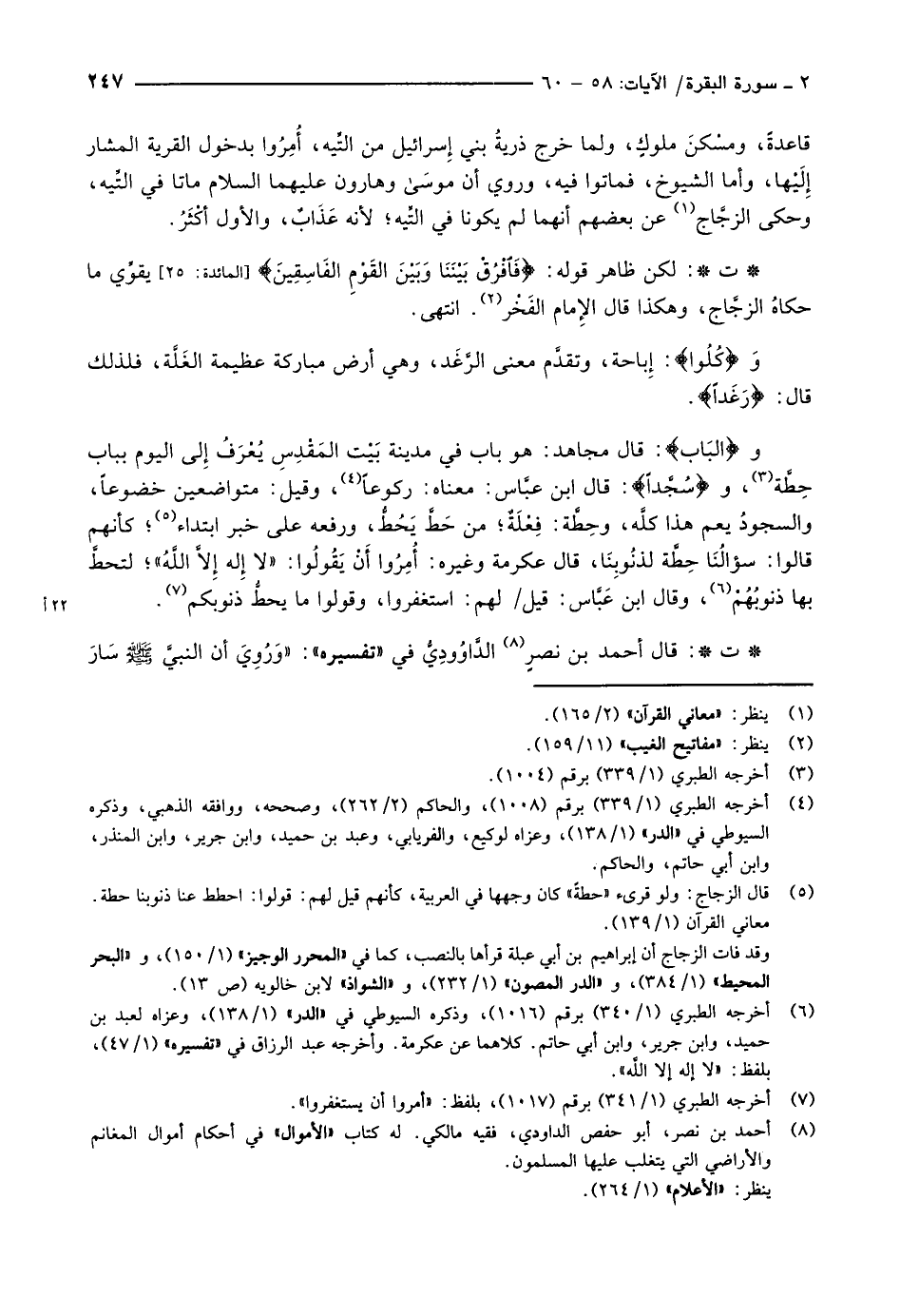 والْبابَ: قال مجاهد: هو باب في مدينة بَيْت المقدس يعرف إلى اليوم بباب حطّة «3» ، وسُجَّداً: قال ابن عبَّاس: معناه: ركوعاً «4» ، وقيل: متواضعين خضوعاً، والسجودُ يعم هذا كلَّه، وحِطَّة: فِعْلَةٌ من حَطَّ يَحُطُّ، ورفعه على خبر ابتداء «5» كأنهم قالوا: سؤالُنَا حِطَّة لذنُوبِنَا، قال عكرمة و، غيره: أُمِرُوا أَنْ يَقُولُوا: «لا إِله إِلاَّ اللَّهُ» لتحطَّ بها ذنوبُهُمْ «6» ، وقال ابن عَبَّاس: قيل/ لهم: استغفروا، وقولوا ما يحطُّ ذنوبكم «7» .