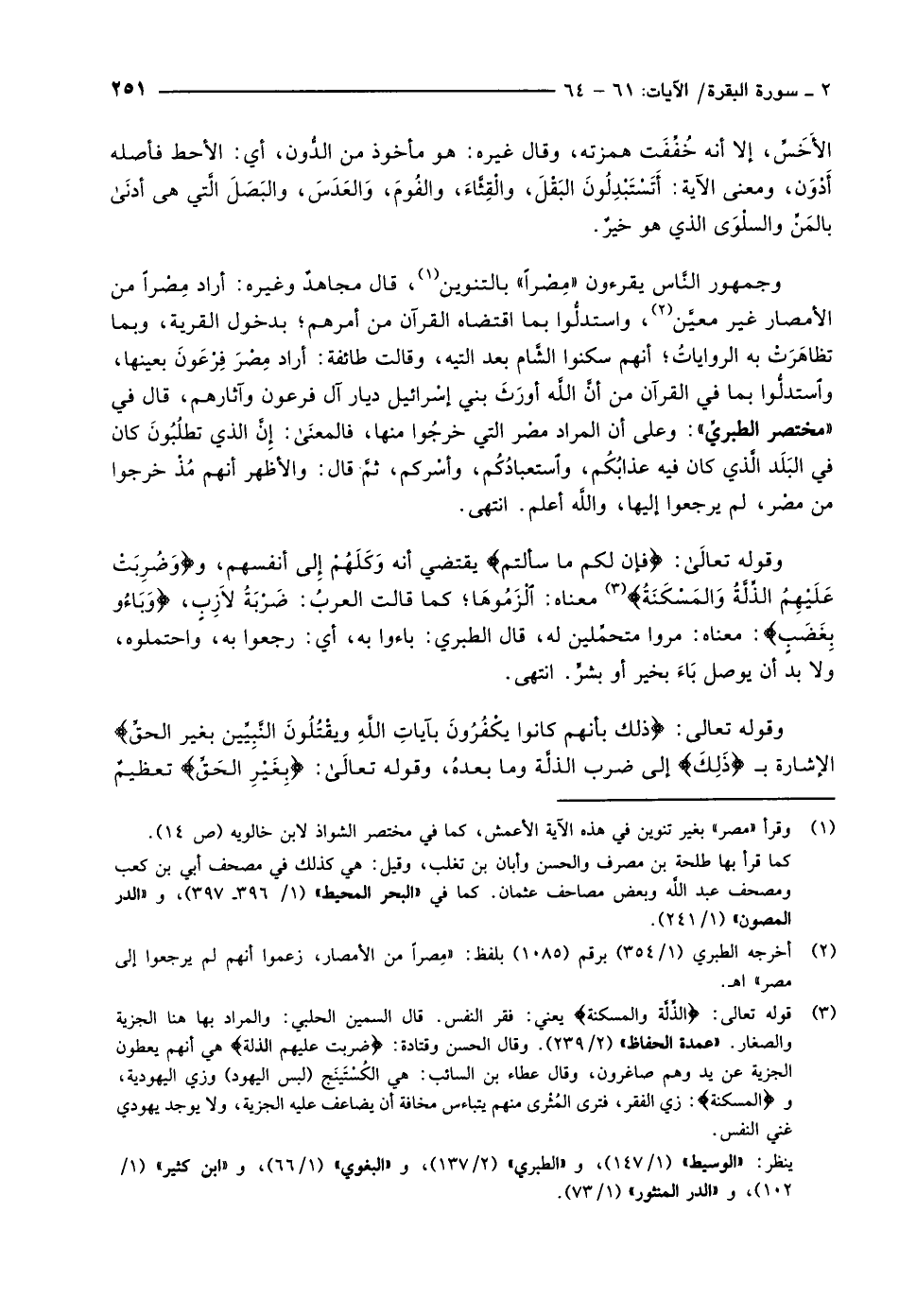 وجمهور النَّاس يقرءون «مِصْراً» بالتنوين «1» ، قال مجاهدٌ وغيره: أراد مِصْراً من الأمصار غير معيَّن «2» ، واستدلُّوا بما اقتضاه القرآن من أمرهم بدخول القرية، وبما تظاهَرَتْ به الرواياتُ أنهم سكنوا الشَّام بعد التيه، وقالت طائفة: أراد مِصْرَ فِرْعَونَ بعينها، واستدلوا بما في القرآن من أنَّ اللَّه أورَثَ بني إسْرائيل ديار آل فرعون وآثارهم، قال في «مختصر الطبريِّ» : وعلى أن المراد مصْر التي خرجُوا منها، فالمعنى: إنَّ الذي تطلُبُونَ كان في البَلَد الَّذي كان فيه عذابُكُم، واستعبادكم، وأسْركم، ثمَّ قال: والأظهر أنهم مُذْ خرجوا من مصْر، لم يرجعوا إليها، واللَّه أعلم. انتهى.