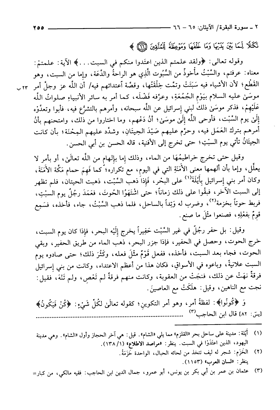 (1) أيلة: مدينة على ساحل بحر «القلزم» مما يلي «الشام» . قيل: هي آخر الحجاز وأول «الشام» . وهي مدينة اليهود، الذين اعتدوا في السبت. ينظر: «مراصد الاطلاع» (1/ 138) .