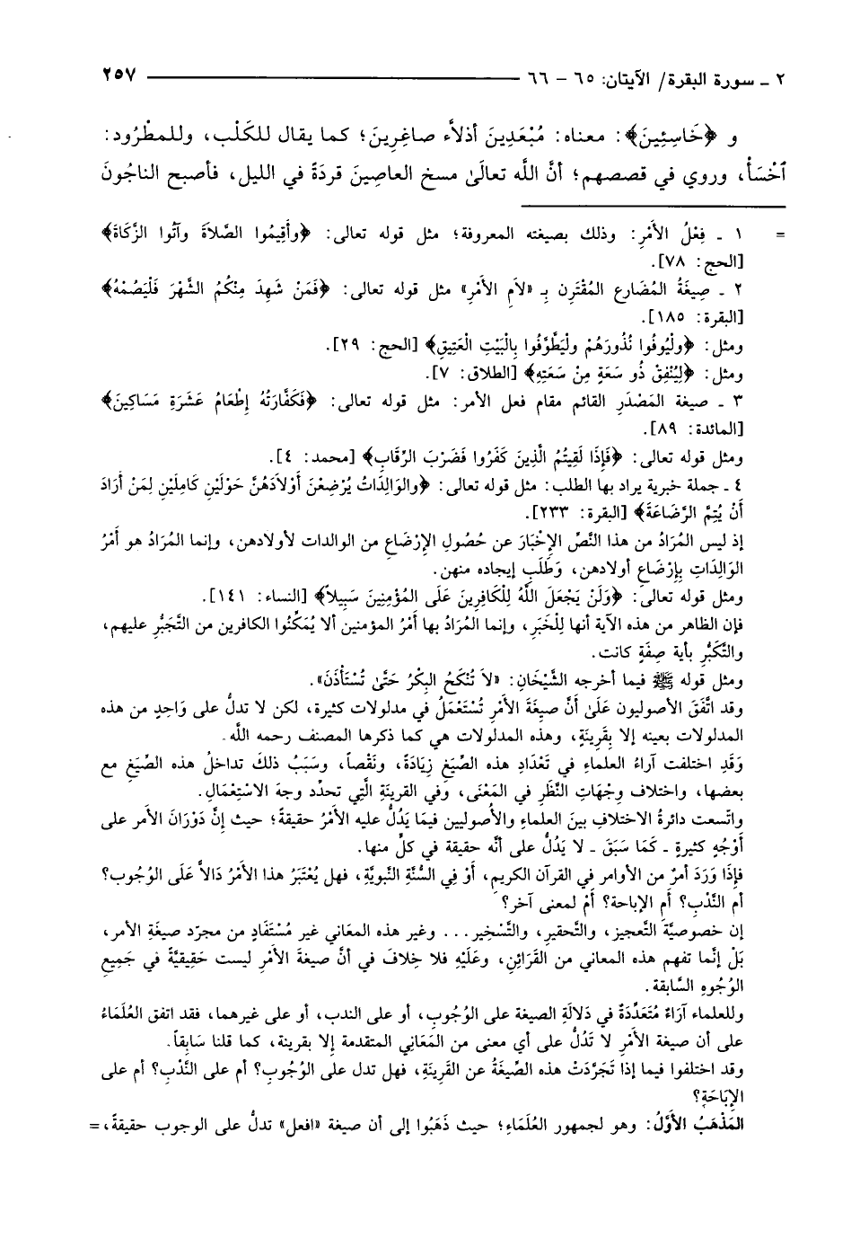 - 1- فعل الأمر: وذلك بصيغته المعروفة مثل قوله تعالى: وَأَقِيمُوا الصَّلاةَ وَآتُوا الزَّكاةَ [الحج: 78] .