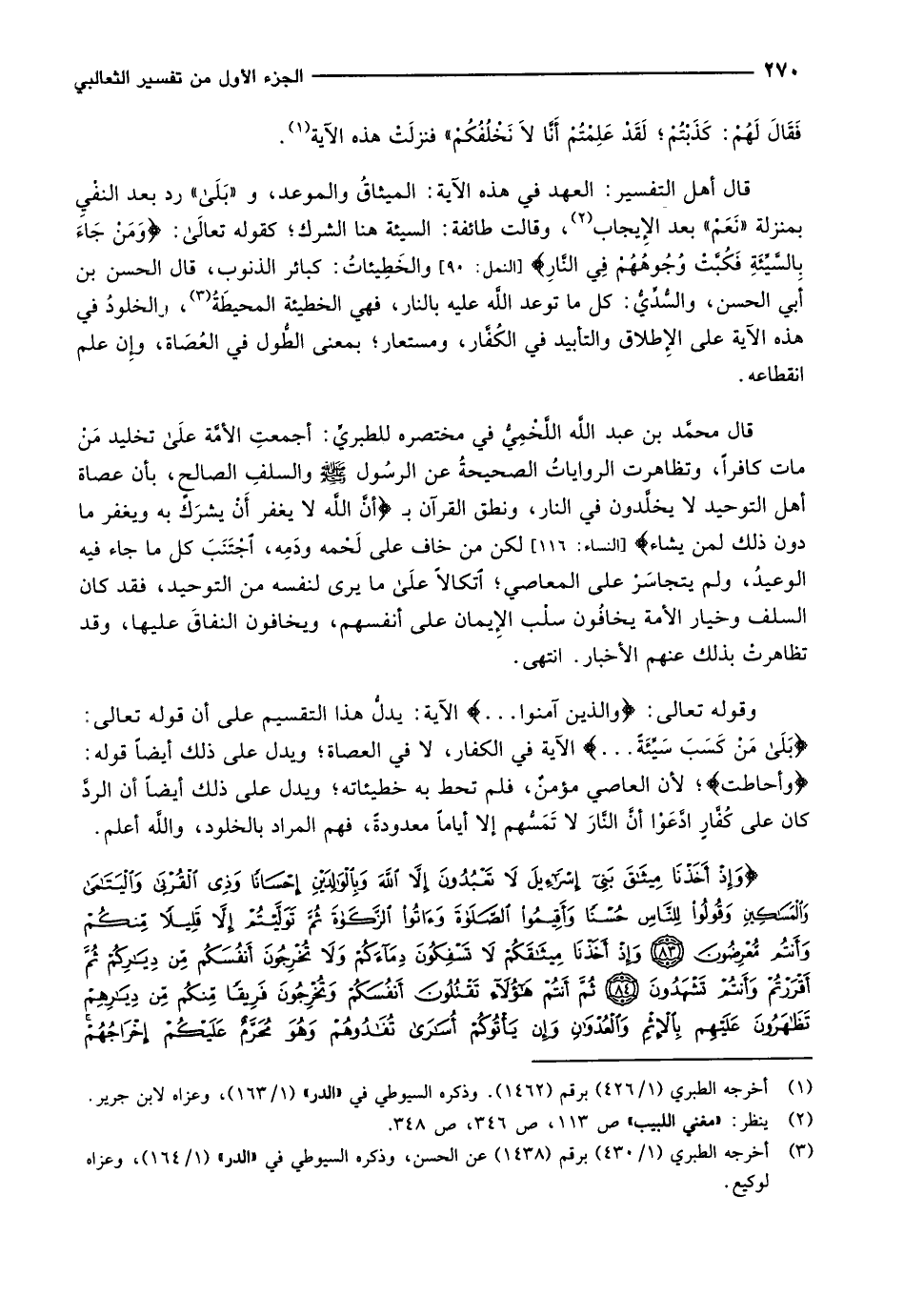 قال محمَّد بن عبد اللَّه اللَّخْمِيُّ في مختصره للطبريِّ: أجمعتِ الأمَّة على تخليد مَنْ مات كافراً، وتظاهرت الرواياتُ الصحيحةُ عن الرسول صلّى الله عليه وسلم والسلفِ الصالح، بأن عصاة أهل التوحيد لا يخلَّدون في النار، ونطق القرآن ب إِنَّ اللَّهَ لاَ يَغْفِرُ أَنْ يُشْرَكَ بِهِ وَيَغْفِرُ مَا دُونَ ذلِكَ لِمَنْ يَشاءُ [النساء: 116] لكن من خاف على لَحْمه ودَمِه، اجتنب كل ما جاء فيه الوعيدُ، ولم يتجاسَرْ على المعاصي اتكالا على ما يرى لنفسه من التوحيد، فقد كان السلف وخيار الأمة يخافُون سلْب الإِيمان على أنفسهم، ويخافون النفاقَ عليها، وقد تظاهرتْ بذلك عنهم الأخبار. انتهى.