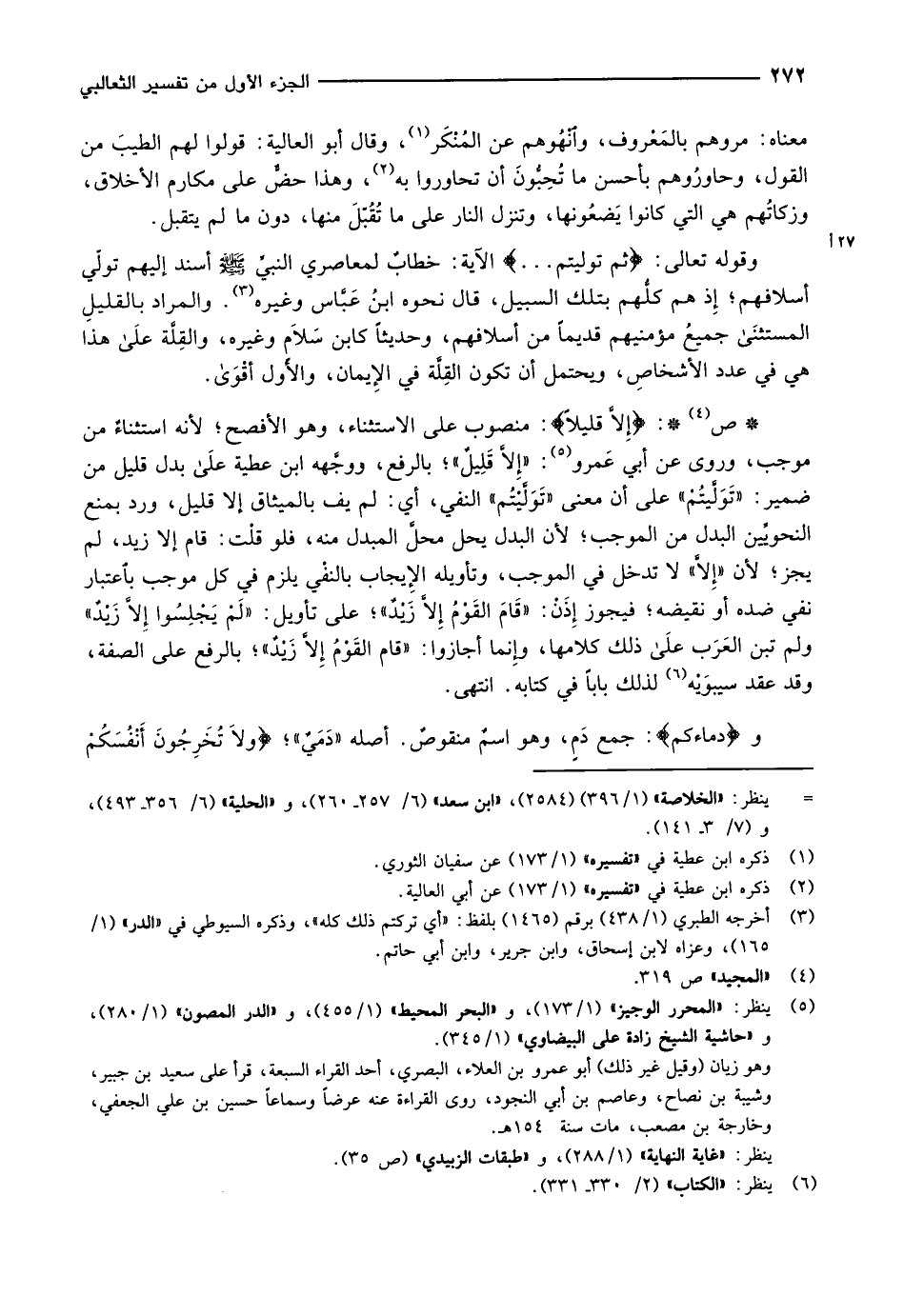 ص «4» : إِلَّا قَلِيلًا: منصوب على الاستثناء، وهو الأفصح لأنه استثناءٌ من موجب، وروي عن أبي عَمرو «5» : «إلاَّ قَلِيلٌ» بالرفع، ووجَّهه ابن عطية على بدل قليل من ضمير: «تَوَلَّيتُمْ» على أن معنى «تَوَلَّيْتُم» النفي، أي: لم يف بالميثاق إلا قليل، ورد بمنع النحويِّين البدل من الموجب لأن البدل يحل محلَّ المبدل منه، فلو قلْت: قام إلا زيد، لم يجز لأن «إِلاَّ» لا تدخل في الموجب، وتأويله الإِيجاب بالنفْي يلزم في كل موجب باعتبار نفي ضده أو نقيضه فيجوز إِذَنْ: «قَامَ القَوْمُ إلاَّ زَيْدٌ» على تأويل: «لَمْ يَجْلِسُوا إِلاَّ زَيْدٌ» ولم تبن العَرَب على ذلك كلامها، وإِنما أجازوا: «قام القَوْمُ إِلاَّ زَيْدٌ» بالرفع على الصفة، وقد عقد سيبوَيْه «6» لذلك بابا في كتابه. انتهى.