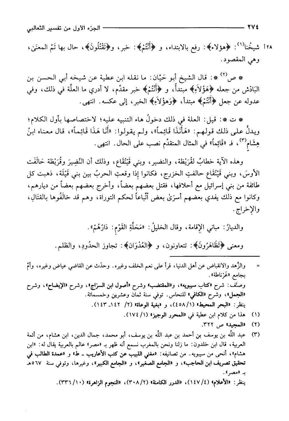 (3) عبد الله بن يوسف بن أحمد بن عبد الله بن يوسف، أبو محمد، جمال الدين، ابن هشام، من أئمة العربية، قال ابن خلدون: ما زلنا ونحن بالمغرب نسمع أنه ظهر ب «مصر» عالم بالعربية يقال له: «ابن هشام» ، أنحى من سيبويه. من تصانيفه: «مغني اللبيب عن كتب الأعاريب- ط» و «عمدة الطالب في تحقيق تصريف ابن الحاجب» ، و «الجامع الصغير» ، و «الجامع الكبير» ، وغيرها، وتوفي سنة 567 هـ.