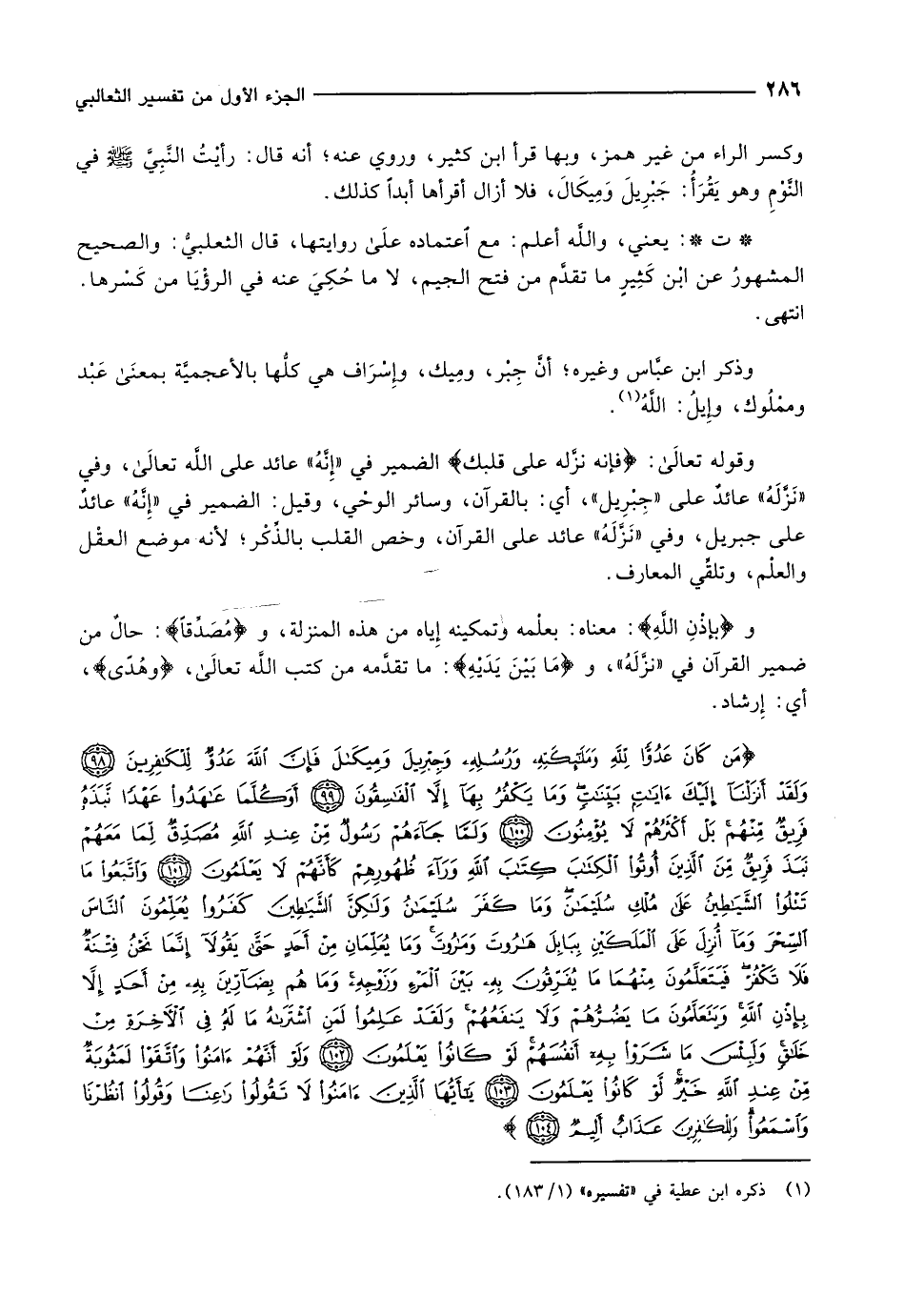 وبِإِذْنِ اللَّهِ: معناه: بعلْمه وتمكينه إِياه من هذه المنزلة، ومُصَدِّقاً: حال من ضمير القرآن في «نزّله» ، ولِما بَيْنَ يَدَيْهِ: ما تقدَّمه من كتب اللَّه تعالى، وَهُدىً، أي: إرشاد.