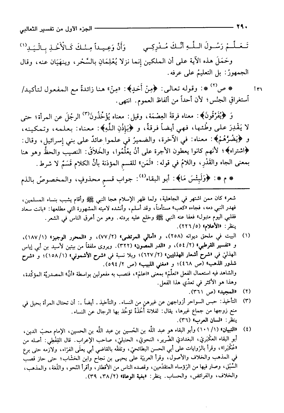 (4) «التبيان» (1/ 101) وأبو البقاء هو عبد الله بن الحسين بن عبد الله بن الحسين، الإمام محبّ الدين، أبو البقاء العكبريّ، البغداديّ الضّرير، النحويّ، الحنبليّ، صاحب الإعراب. قال القفطي: أصله من «عكبرا» ، وقرأ بالرّوايات على أبي الحسن البطائحيّ، وتفقّه بالقاضي أبي يعلى الفرّاء، ولازمه حتى برع في المذهب والخلاف والأصول، وقرأ العربيّة على يحيى بن نجاح وابن الخشّاب حتى حاز قصب السّبق، وصار فيها من الرّؤساء المتقدّمين، وقصده الناس من الأقطار، وأقرأ النّحو، واللّغة، والمذهب، والخلاف، والفرائض، والحساب. ينظر: «بغية الوعاة» (2/ 38، 39) .
