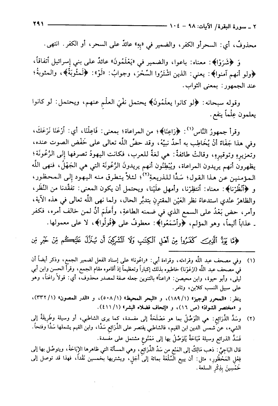 (1) وفي مصحف عبد الله وقراءته، وقراءة أبي: «راعونا» على إسناد الفعل لضمير الجمع، وذكر أيضا أن في مصحف عبد الله (ارعونا) خاطبوه بذلك إكبارا وتعظيما إذ أقاموه مقام الجمع، وقرأ الحسن وابن أبي ليلى، وأبو حيوة، وابن محيصن: «راعنا» بالتنوين جعله صفة لمصدر محذوف، أي: قولا راعنا، وهو على سبيل النسب كلابن، وتامر.