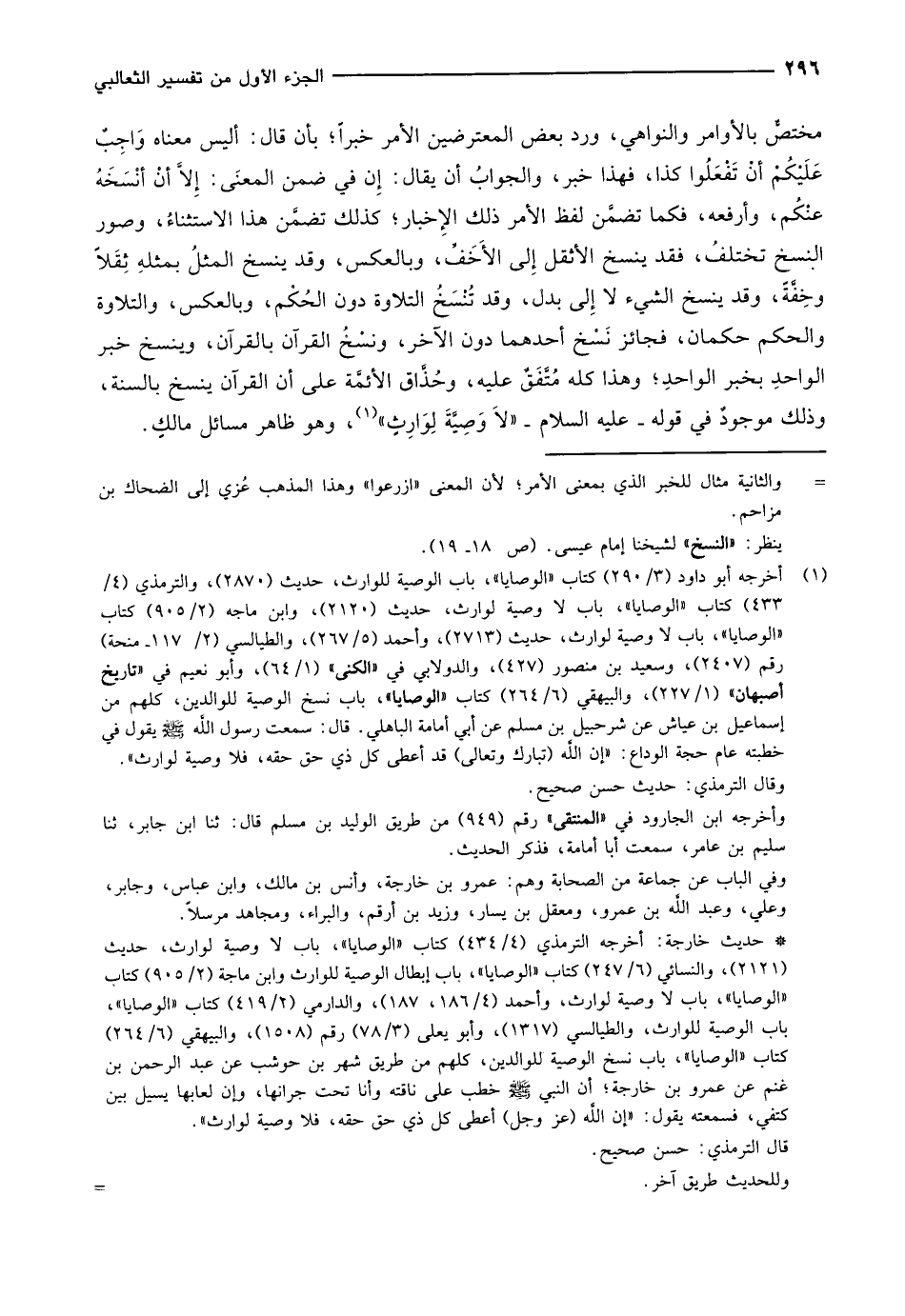 حديث خارجة: أخرجه الترمذي (4/ 434) كتاب «الوصايا» ، باب لا وصية لوارث، حديث (2121) ، والنسائي (6/ 247) ، كتاب «الوصايا» ، باب إبطال الوصية للوارث وابن ماجة (2/ 905) كتاب «الوصايا» ، باب لا وصية لوارث، وأحمد (4/ 186، 187) ، والدارمي (2/ 419) كتاب «الوصايا» ، باب الوصية للوارث، والطيالسي (1317) ، وأبو يعلى (3/ 78) رقم (1508) ، والبيهقي (6/ 264) كتاب «الوصايا» ، باب نسخ الوصية للوالدين، كلهم من طريق شهر بن حوشب عن عبد الرحمن بن غنم عن عمرو بن خارجة أن النبي صلّى الله عليه وسلم خطب على ناقته وأنا تحت جرانها، وإن لعابها يسيل بين كتفي، فسمعته يقول: «إن الله (عز وجل) أعطى كل ذي حق حقه، فلا وصية لوارث» .