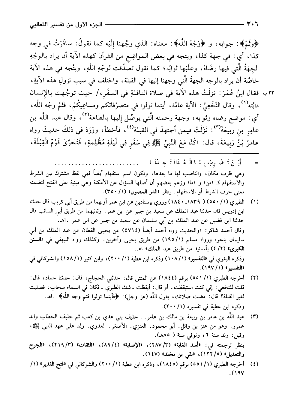 وفَثَمَّ: جوابه، ووَجْهُ اللَّهِ: معناه: الذي وجَّهنا إِلَيْه كما تقولُ: سافَرْتُ في وجه كذا، أي: في جهة كذا، ويتجه في بعض المواضِعِ من القرآن كهذه الآية أن يراد بالوجْهِ الجِهَةُ الَّتي فيها رضَاهُ، وعلَيْها ثوابُه كما تقول تصدَّقت لوجْهِ اللَّهِ، ويتَّجه في هذه الآية خاصَّة أن يراد بالوجه الجهةُ الَّتي وجهنا إليها في القبلة، واختلف في سبب نزولِ هذه الآية، 33 ب فقال ابنُ عُمَرَ: نزلَتْ هذه الآية في صلاة النافلةِ في السفَرِ، / حيث توجَّهت بالإِنسان دابَّته «1» ، وقال النَّخَعِيُّ: الآية عامَّة، أينما تولوا في متصرَّفاتكم ومساعِيكُمْ، فثَمَّ وجْه اللَّه، أي: موضع رضاه، وثوابه، وجهة رحمته الَّتي يوصِّل إِليها بالطاعة «2» ، وقال عبد اللَّه بن عامِرِ بنِ ربيعَةَ «3» : نَزَلَتْ فيمن اجتهد في القبلة «4» ، فأخطأ، ووَرَدَ في ذلكَ حديثٌ رواه عامرُ بن ربيعة، قال: «كنّا مع النّبيّ صلّى الله عليه وسلم فِي سَفَرٍ فِي لَيْلَةٍ مُظْلِمَةٍ، فتحرى قَوْمٌ القبلة،