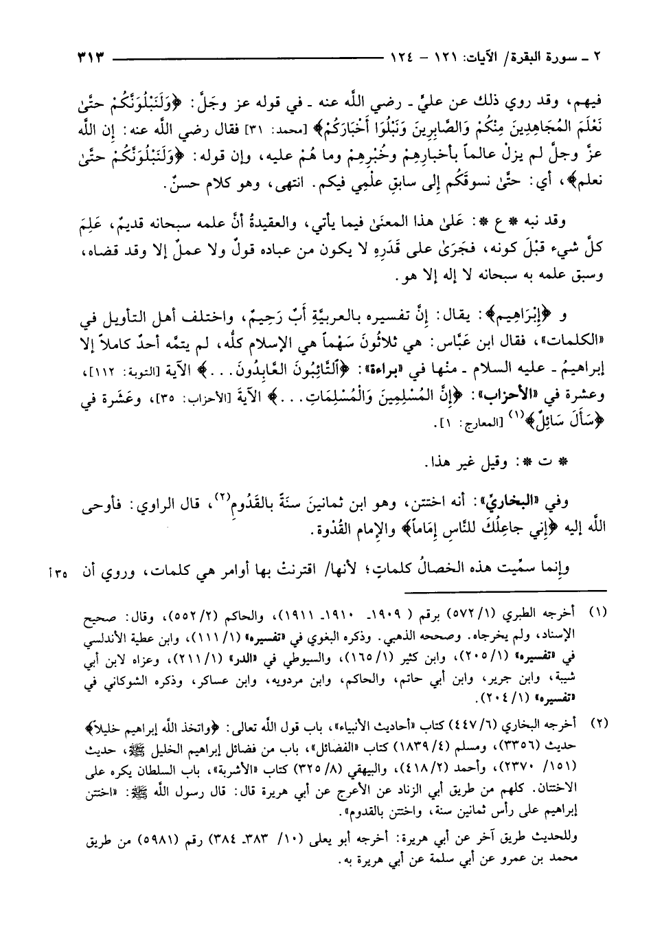 وفي «البخاريِّ» : أنه اختتن، وهو ابن ثمانينَ سنَةً بالقَدُومِ «2» ، قال الراوي: فأوحى اللَّه إليه إِنِّي جاعِلُكَ لِلنَّاسِ إِماماً والإِمام القُدْوة.