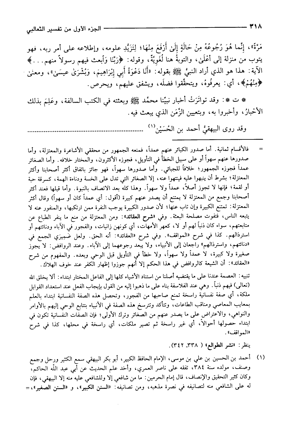 (1) أحمد بن الحسين بن علي بن موسى، الإمام الحافظ الكبير، أبو بكر البيهقي سمع الكثير ورحل وجمع وصنف، مولده سنة 384، تفقه على ناصر العمري، وأخذ علم الحديث عن أبي عبد الله الحاكم، وكان كثير التحقيق والإنصاف، قال إمام الحرمين: ما من شافعي إلا وللشافعي عليه منه إلا البيهقي، فإن له على الشافعي منه لتصانيفه في نصرة مذهبه، ومن تصانيفه: «السنن الكبير» ، و «السنن الصغير» ، -