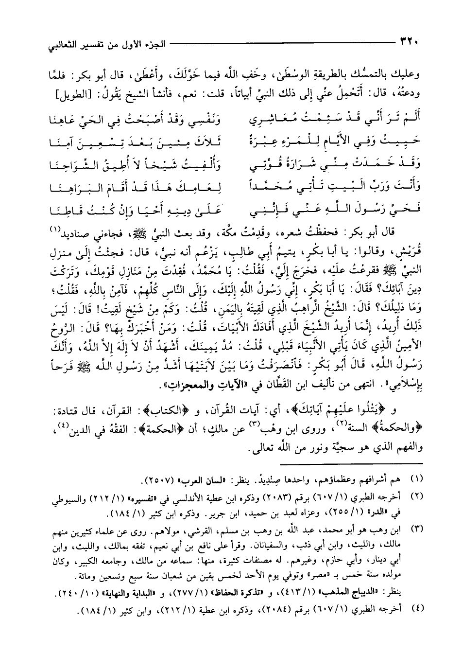 قال أبو بكر: فحفظْتُ شعره، وقدمت مكّة، وقد بعث النبيّ صلّى الله عليه وسلم، فجاءني صناديد «1» قُرَيْشٍ، وقالوا: يا أبا بكْرٍ، يتيمُ أَبِي طالِبٍ، يَزْعُم أنه نبيٌّ، قال: فجئت إلى منزل النبيّ صلّى الله عليه وسلم فقرعْتُ علَيْه، فخرَجَ إِلَيَّ، فَقُلْتُ: يَا مُحَمَّدُ، فُقِدْتَ مِنْ مَنَازِلِ قَوْمِكَ، وَتَرَكْتَ دِينَ آبَائِكَ؟ فَقَالَ: يَا أَبَا بَكْرٍ، إِنِّي رَسُولُ اللَّهِ إِلَيْكَ، وَإِلَى النَّاسِ كُلِّهِمْ، فَآمِنْ بِاللَّهِ، فَقُلْتُ وَمَا دَلِيلُكَ؟ قَالَ: الشَّيْخُ الَّراهِبُ الَّذِي لَقِيتَهُ بِاليَمَنِ، قُلْتُ: وَكَمْ مِنْ شَيْخٍ لَقِيتُ! قَالَ: لَيْسَ ذَلِكَ أُرِيدُ، إِنَّمَا أُرِيدُ الشَّيْخَ الَّذِي أَفَادَكَ الأَبْيَاتَ، قُلْتُ: وَمَنْ أَخْبَرَكَ بِهَا؟ قَالَ: الرُّوحُ الأمِينُ الَّذِي كَانَ يَأْتِي الأَنْبِيَاءَ قَبْلِي، قُلْتُ: مُدَّ يَمِينَكَ، أَشْهَدُ أَنْ لاَ إِلَهَ إِلاَّ اللَّهُ، وَأَنَّكَ رَسُولُ اللَّهِ، قَالَ أَبُو بَكْرٍ: فانصرفت وَمَا بَيْنَ لاَبَتَيْهَا أَشَدُّ مِنْ رسول الله صلّى الله عليه وسلم فَرَحاً بِإِسْلاَمِي» . انتهى من تأليف ابن القَطَّان في «الآيات والمعجزات» .