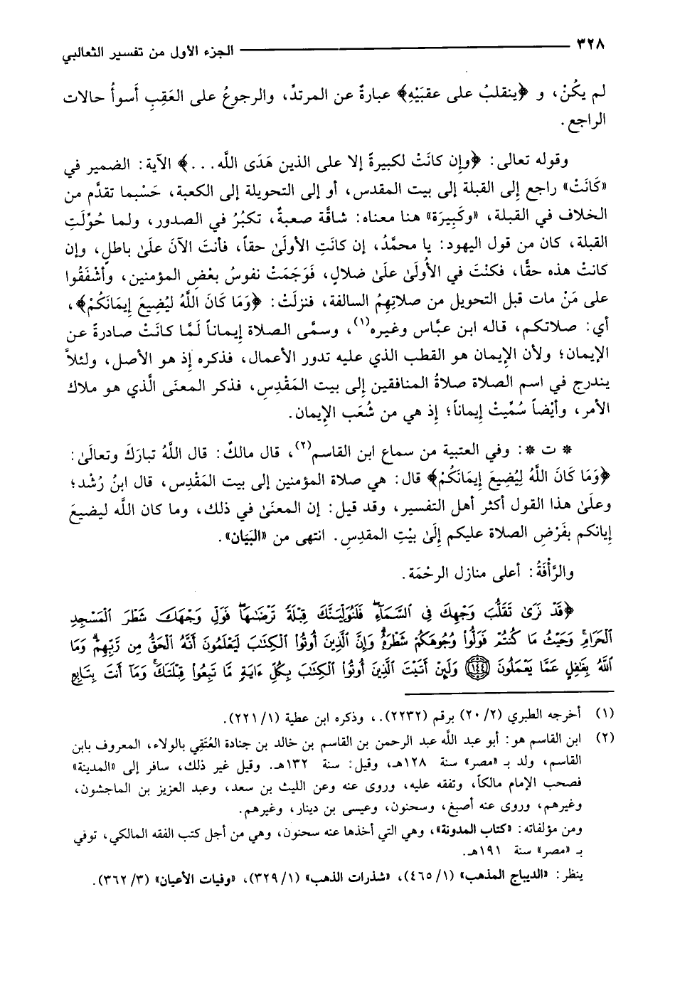 وَما كانَ اللَّهُ لِيُضِيعَ إِيمانَكُمْ قال: هي صلاة المؤمنين إلى بيت المَقْدِس، قال ابنُ رُشْد وعلى هذا القول أكثر أهل التفسير، وقد قيل: إن المعنى في ذلك، وما كان اللَّه ليضيعَ إِيمانكم بفَرْضِ الصلاة عليكم إلى بيْتِ المقدِسِ. انتهى من «البَيَان» .