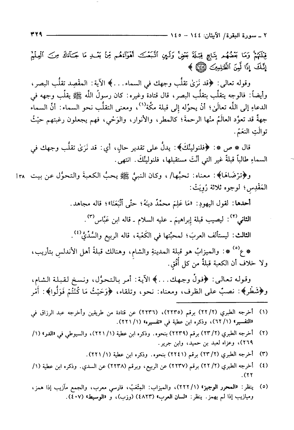 وقوله تعالى: قَدْ نَرى تَقَلُّبَ وَجْهِكَ فِي السَّماءِ ... الآية: المقْصِد تقلُّب البصر، وأيضاً: فالوجه يتقلَّب بتقلُّب البصر، قال قتادة وغيره: كان رسول الله صلّى الله عليه وسلم يقلِّب وجهه في الدعاءِ إلى اللَّه تعالى أنْ يحوِّله إِلى قبلة مكَّة «1» ، ومعنى التقلُّب نحو السماء: أنَّ السماء جهةٌ قد تعوَّد العالَمُ منْها الرحمةَ كالمطر، والأنوار، والوَحْي، فهم يجعلون رغبتهم حيْثُ توالَتِ النعَمُ.