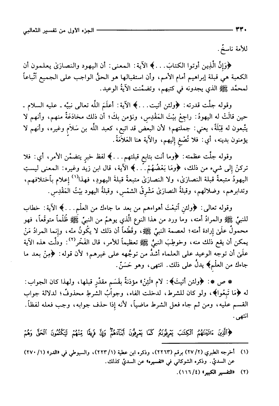 وَإِنَّ الَّذِينَ أُوتُوا الْكِتابَ ... الآية: المعنى: أن اليهود والنصارى يعلمون أن الكعبة هي قبلة إبراهيم أمام الأمم، وأن استقبالها هو الحقُّ الواجب على الجميع اتباعا لمحمَّد صلّى الله عليه وسلم الذي يجدونه في كتبهم، وتضمَّنت الآيةُ الوعيد.