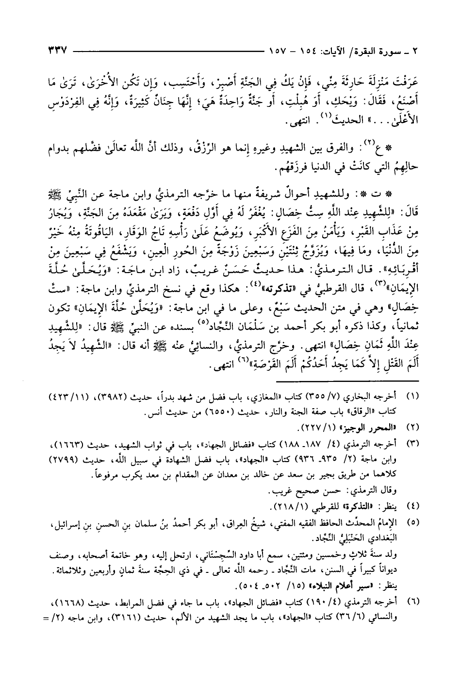 ت: وللشهيدِ أحوالٌ شريفةٌ منها ما خرَّجه الترمذيُّ وابن ماجة عن النبيّ صلّى الله عليه وسلم قَالَ: «لِلشَّهِيدِ عِنْد اللَّهِ سِتُّ خِصَالٍ: يُغْفَرُ لَهُ فِي أَوَّلِ دَفْعَةٍ، ويرى مَقْعَدَهُ مِنَ الجَنَّةِ، وَيُجَارُ مِنْ عَذَابِ القَبْرِ، وَيَأْمَنُ مِنَ الفَزَعِ الأَكْبَرِ، وَيُوضَعُ على رَأْسِهِ تَاجُ الوَقَارِ، اليَاقُوتَةُ مِنْهُ خَيْرٌ مِنَ الدُّنْيَا، ومَا فِيهَا، وَيُزَوَّجُ ثِنْتَيْنِ وَسَبْعِينَ زَوْجَةً مِنَ الحُورِ الْعِينِ، وَيَشْفَعُ فِي سَبْعِينَ مِنْ أقْرِبَائِهِ» . قال الترمذيُّ: هذا حديثٌ حَسَنٌ غريبٌ، زاد ابن ماجَة: «ويحلى حُلَّةَ الإِيمَانِ» «3» ، قال القرطبيُّ في «تذكرته» «4» : هكذا وقع في نسخ الترمذيِّ وابن ماجة: «ستَّ خِصَالٍ» وهي في متن الحديث سَبْعٌ، وعلى ما في ابن ماجة: «ويحلى حُلَّةَ الإِيمَانِ» تكون ثمانياً، وكذا ذكره أبو بكر أحمد بن سَلْمَان النَّجَّاد «5» بسنده عن النبيِّ صلّى الله عليه وسلم قال: «لِلشَّهِيدِ عِنْدَ اللَّهِ ثَمَانِ خِصَالٍ» انتهى. وخرّج الترمذيّ، والنسائيّ عنه صلّى الله عليه وسلم أنه قال: «الشَّهِيدُ لاَ يَجِدُ أَلَمَ القَتْلِ إلاَّ كَمَا يَجِدُ أَحَدُكُمْ أَلَمَ القَرْصَةِ» «6» انتهى.