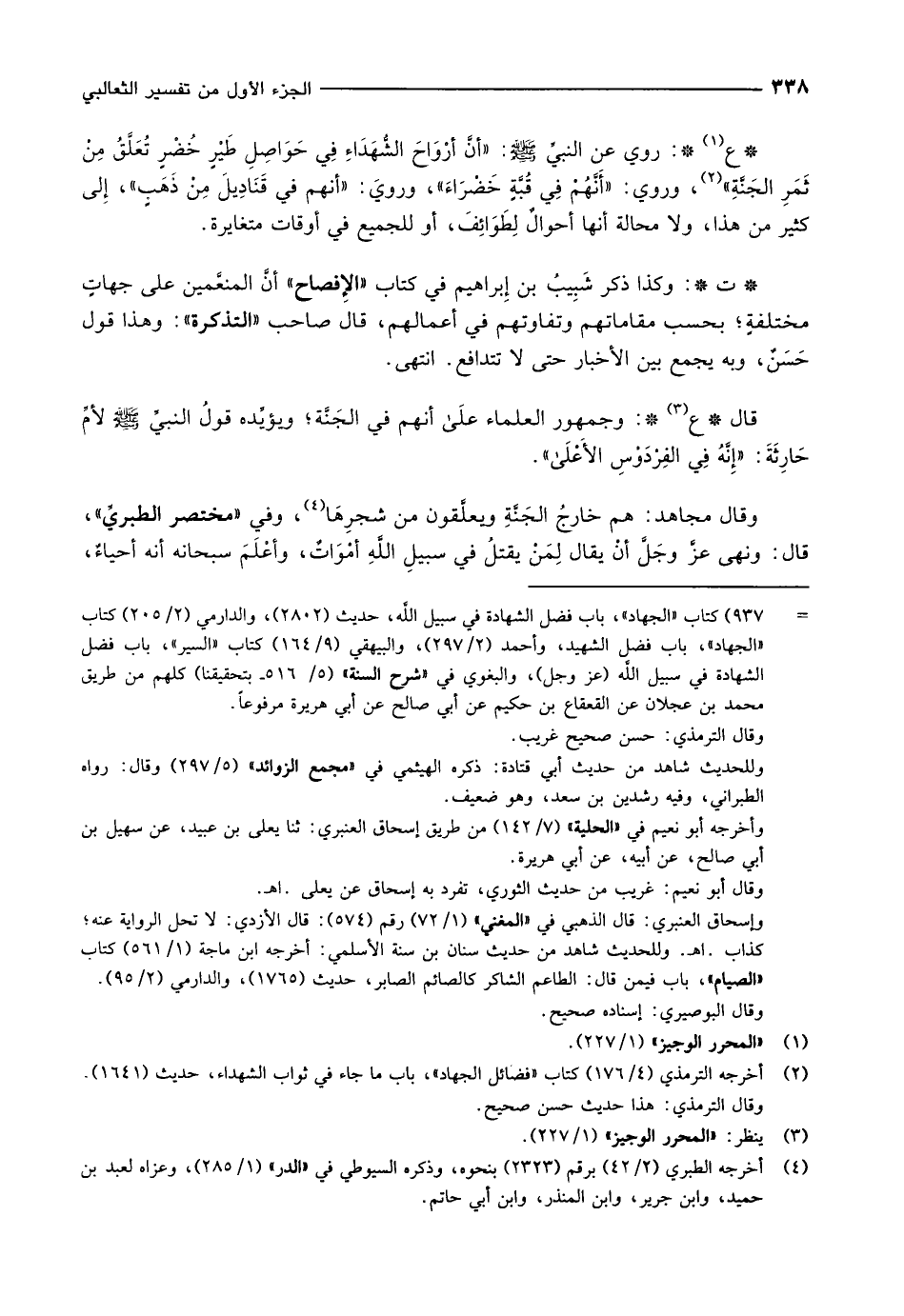 ع «1» : روي عن النبيّ صلّى الله عليه وسلم: «أنَّ أرْوَاحَ الشُّهَدَاءِ فِي حَوَاصِلِ طَيْرٍ خُضْرٍ تُعَلَّقُ مِنْ ثَمَرِ الجَنَّةِ» «2» ، وروي: «أَنَّهُمْ فِي قُبَّةٍ خَضْرَاءَ» ، ورويَ: «أنهم في قَنَادِيلَ مِنْ ذَهَبٍ» ، إِلى كثير من هذا، ولا محالة أنها أحوالٌ لِطَوَائِفَ، أو للجميع في أوقات متغايرة.
