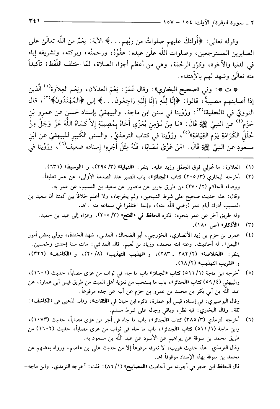 ت: وفي «صحيح البخاري» : وقال عُمَرُ: نِعْمَ العدلان، ونَعْمُ العِلاَوة «1» الَّذين إذا أصابتهم مصيبةٌ، قالوا: إِنَّا لِلَّهِ وَإِنَّا إِلَيْهِ راجِعُونَ ... إلى الْمُهْتَدُونَ «2» ، قال النوويُّ في «الحلية» «3» : ورُوِّينا في سنن ابن ماجة، والبيهقيِّ بإِسناد حَسَنٍ عن عمرو بن حزم «4» عن النبيّ صلّى الله عليه وسلم قَالَ: «مَا مِنْ مُؤْمِنٍ يُعَزِّي أَخَاهُ بِمُصِيبَةٍ إلّا كساه عَزَّ وَجَلَّ مِنْ حُلَلِ الكَرَامَةِ يَوْم القِيَامَةِ» «5» ، ورُوِّينا في كتاب الترمذيِّ، والسنن الكَبيِرِ للبيهقيِّ عن ابن مسعود عن النبيّ صلّى الله عليه وسلم قَالَ: «مَنْ عزى مُصَابًا، فَلَهُ مِثْلُ أَجْرِهِ» إسناده ضعيف «6» ، وروّينا في