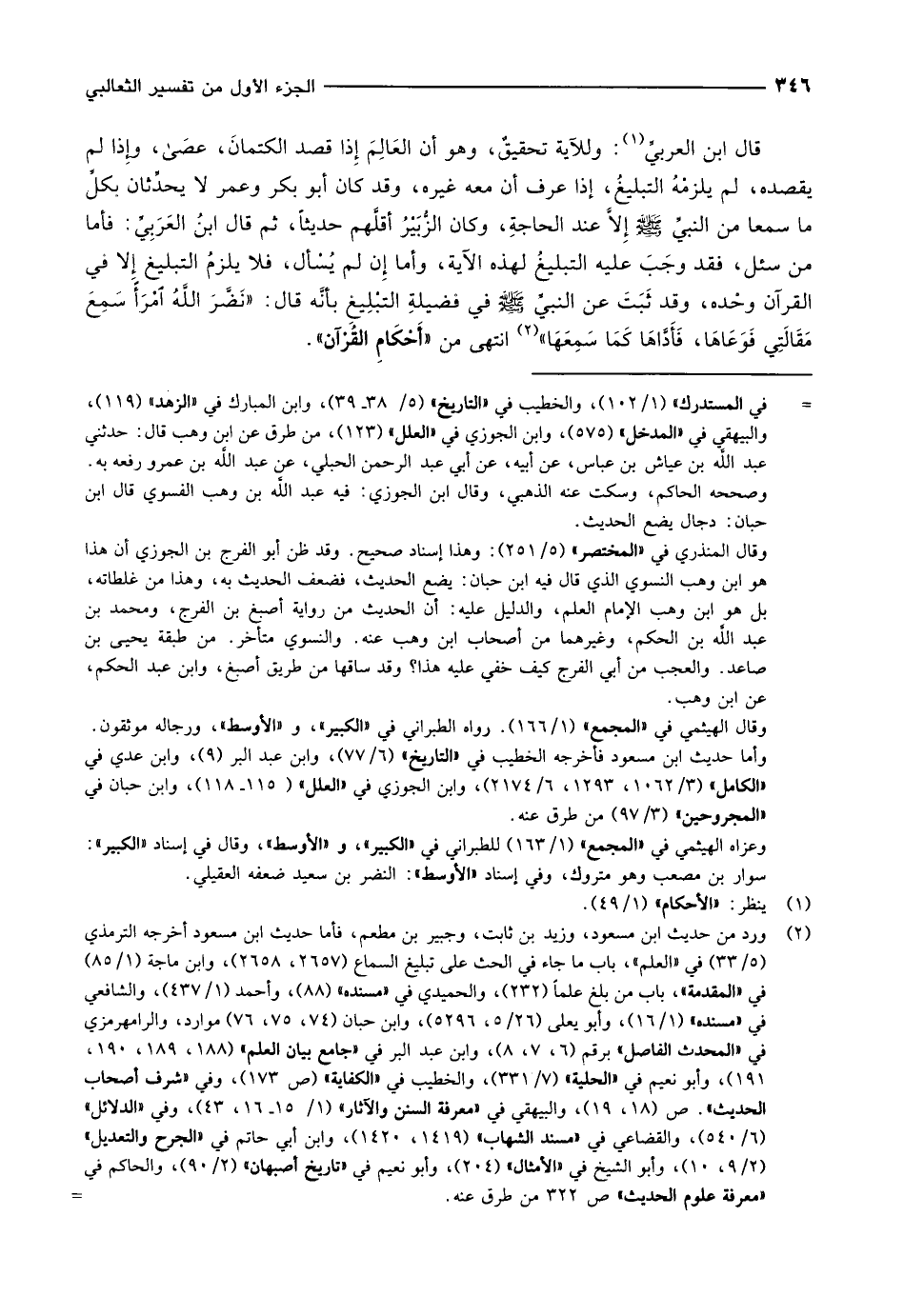 قال ابن العربيِّ «1» : وللآية تحقيقٌ، وهو أن العَالِمَ إِذا قصد الكتمانَ، عصى، وإِذا لم يقصده، لم يلزمْهُ التبليغُ، إذا عرف أن معه غيره، وقد كان أبو بكر وعمر لا يحدِّثان بكلِّ ما سمعا من النبيِّ صلّى الله عليه وسلم إِلاَّ عند الحاجةِ، وكان الزُّبَيْرُ أقلَّهم حديثاً، ثم قال ابنُ العَرَبِيِّ: فأما من سئل، فقد وجَبَ عليه التبليغُ لهذه الآية، وأما إِن لم يُسْأل، فلا يلزمُ التبليغ إِلا في القرآن وحْده، وقد ثَبَتَ عن النبيِّ صلّى الله عليه وسلم في فضيلةِ التبْلِيغِ بأنَّه قال: «نَضَّرَ اللَّهُ امرأ سَمِعَ مَقَالَتِي فَوَعَاهَا، فَأَدَّاهَا كَمَا سَمِعَهَا» «2» انتهى من «أحكام القرآن» .