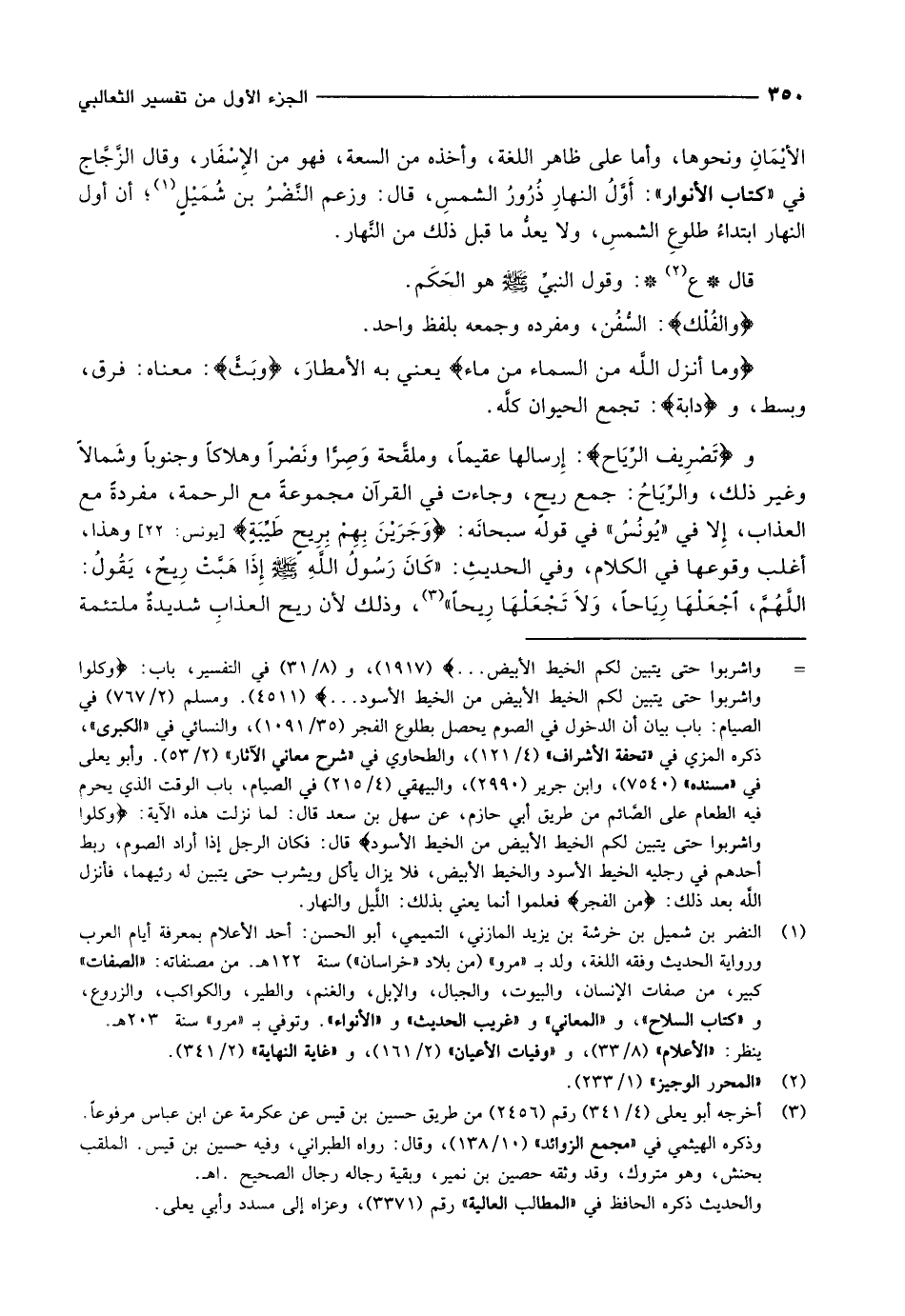 (1) النضر بن شميل بن خرشة بن يزيد المازني، التميمي، أبو الحسن: أحد الأعلام بمعرفة أيام العرب ورواية الحديث وفقه اللغة، ولد ب «مرو» (من بلاد «خراسان» ) سنة 122 هـ. من مصنفاته: «الصفات» كبير، من صفات الإنسان، والبيوت، والجبال، والإبل، والغنم، والطير، والكواكب، والزروع، و «كتاب السلاح» ، و «المعاني» و «غريب الحديث» و «الأنواء» . وتوفي ب «مرو» سنة 203 هـ.