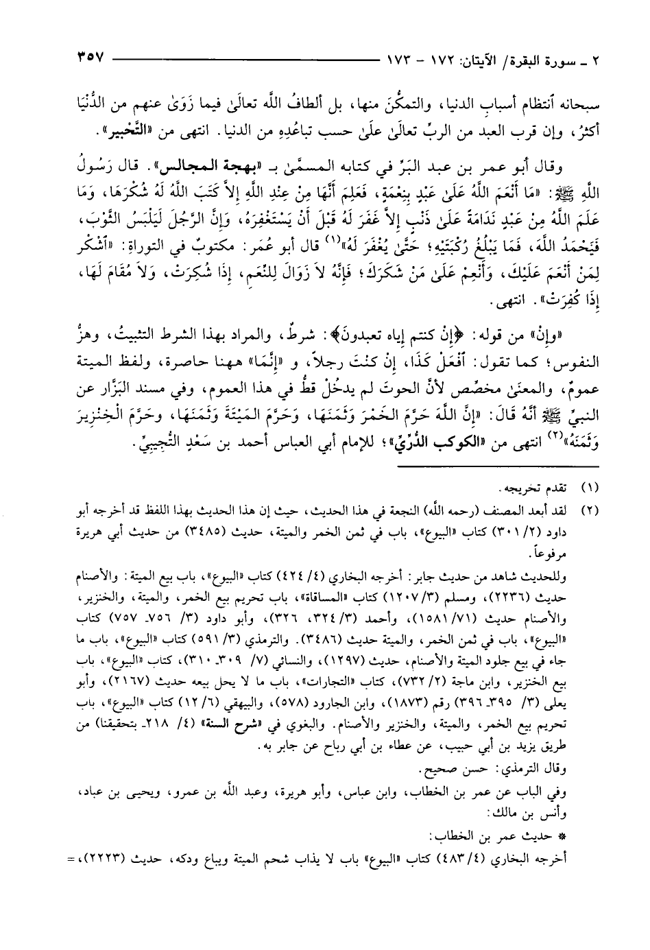 «وإِنْ» من قوله: إِنْ كُنْتُمْ إِيَّاهُ تَعْبُدُونَ: شرطٌ، والمراد بهذا الشرط التثبيتُ، وهزُّ النفوس كما تقول: افعل كَذَا، إِنْ كنْتَ رجلاً، و «إِنَّمَا» هاهنا حاصرة، ولفظ الميتة عمومٌ، والمعنى مخصِّص لأنَّ الحوتَ لم يدخُلْ قطُّ في هذا العموم، وفي مسند البزّار عن النبيّ صلّى الله عليه وسلم أنَّهُ قَالَ: «إِنَّ اللَّهَ حَرَّمَ الخَمْرَ وَثَمَنَهَا، وَحَرَّمَ المَيْتَةَ وَثَمَنَهَا، وحَرَّمَ الْخِنْزِيرَ، وَثَمَنَهُ» «2» انتهى من «الكوكب الدُّرِّيِّ» للإمام أبي العباس أحمد بن سعد التّجيبيّ.
