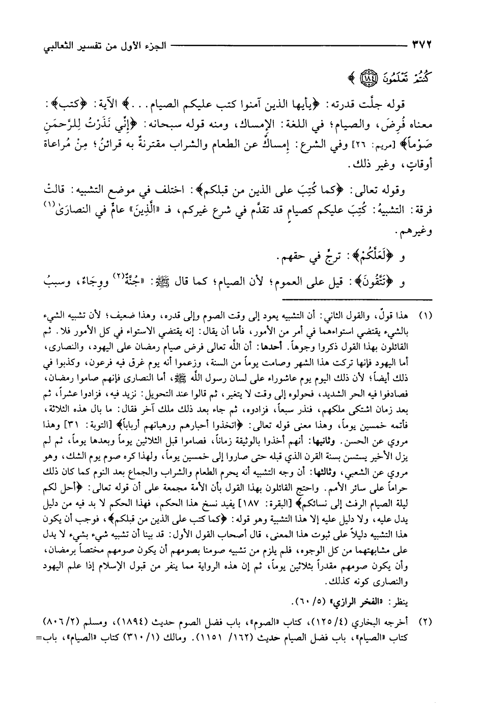 (1) هذا قول، والقول الثاني: أن التشبيه يعود إلى وقت الصوم وإلى قدره، وهذا ضعيف لأن تشبيه الشيء بالشيء يقتضي استواءهما في أمر من الأمور، فأما أن يقال: إنه يقتضي الاستواء في كل الأمور فلا. ثم القائلون بهذا القول ذكروا وجوها. أحدها: أن الله تعالى فرض صيام رمضان على اليهود، والنصارى، أما اليهود فإنها تركت هذا الشهر وصامت يوما من السنة، وزعموا أنه يوم غرق فيه فرعون، وكذبوا في ذلك أيضا لأن ذلك اليوم يوم عاشوراء على لسان رسول الله صلّى الله عليه وسلم، أما النصارى فإنهم صاموا رمضان، فصادفوا فيه الحر الشديد، فحولوه إلى وقت لا يتغير، ثم قالوا عند التحويل: نزيد فيه، فزادوا عشرا، ثم بعد زمان اشتكى ملكهم، فنذر سبعا، فزادوه، ثم جاء بعد ذلك ملك آخر فقال: ما بال هذه الثلاثة، فأتمه خمسين يوما، وهذا معنى قوله تعالى: اتَّخَذُوا أَحْبارَهُمْ وَرُهْبانَهُمْ أَرْباباً [التوبة: 31] وهذا مروي عن الحسن. وثانيها: أنهم أخذوا بالوثيقة زمانا، فصاموا قبل الثلاثين يوما وبعدها يوما، ثم لم يزل الأخير يستسن بسنة القرن الذي قبله حتى صاروا إلى خمسين يوما، ولهذا كره صوم يوم الشك، وهو مروي عن الشعبي، وثالثها: أن وجه التشبيه أنه يحرم الطعام والشراب والجماع بعد النوم كما كان ذلك حراما على سائر الأمم. واحتج القائلون بهذا القول بأن الأمة مجمعة على أن قوله تعالى: أُحِلَّ لَكُمْ لَيْلَةَ الصِّيامِ الرَّفَثُ إِلى نِسائِكُمْ [البقرة: 187] يفيد نسخ هذا الحكم، فهذا الحكم لا بد فيه من دليل يدل عليه، ولا دليل عليه إلا هذا التشبيه وهو قوله: كَما كُتِبَ عَلَى الَّذِينَ مِنْ قَبْلِكُمْ، فوجب أن يكون هذا التشبيه دليلا على ثبوت هذا المعنى، قال أصحاب القول الأول: قد بينا أن تشبيه شيء بشيء لا يدل على مشابهتهما من كل الوجوه، فلم يلزم من تشبيه صومنا بصومهم أن يكون صومهم مختصا برمضان، وأن يكون صومهم مقدرا بثلاثين يوما، ثم إن هذه الرواية مما ينفر من قبول الإسلام إذا علم اليهود والنصارى كونه كذلك.