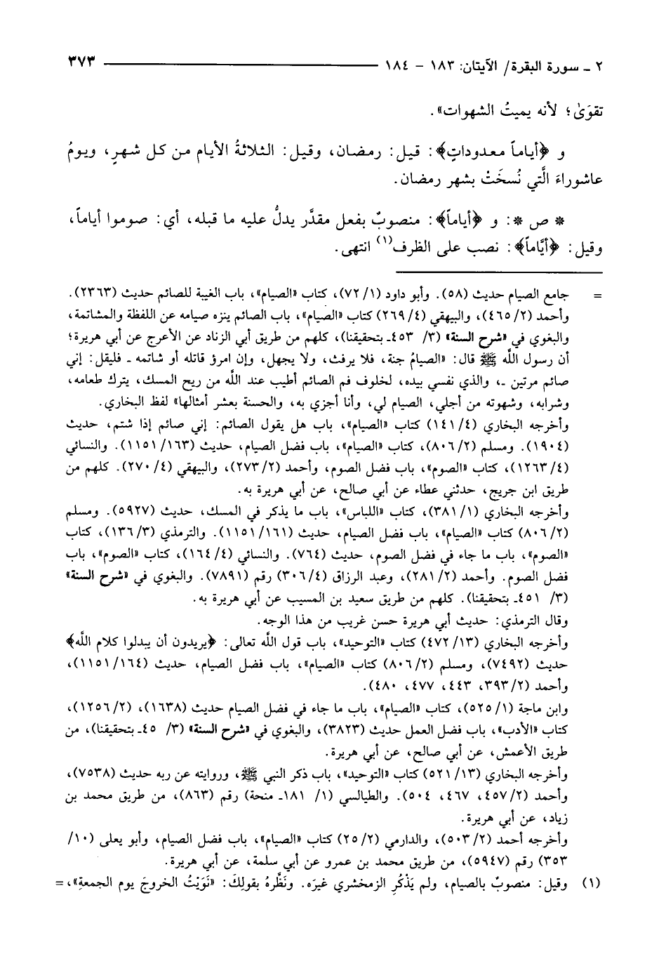 وأَيَّاماً مَعْدُوداتٍ: قيل: رمضان، وقيل: الثلاثةُ الأيام من كل شهرٍ، ويومُ عاشوراءَ الَّتي نُسخَتْ بشهر رمضان.
