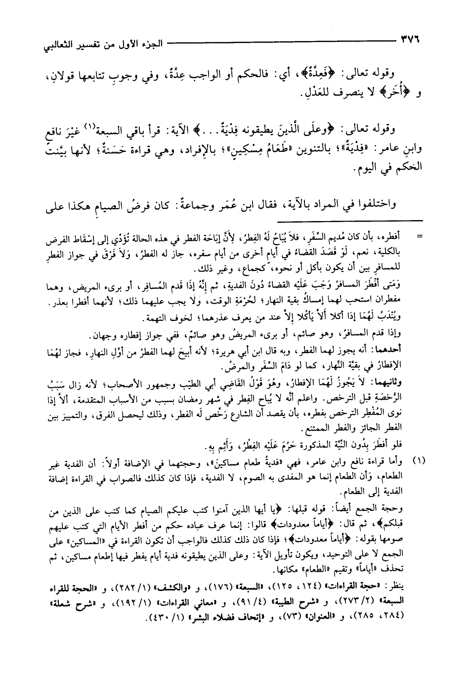 (1) وأما قراءة نافع وابن عامر، فهي «فدية طعام مساكين» ، وحجتهما في الإضافة أولا: أن الفدية غير الطعام، وأن الطعام إنما هو المفدى به الصوم، لا الفدية، فإذا كان كذلك فالصواب في القراءة إضافة الفدية إلى الطعام.