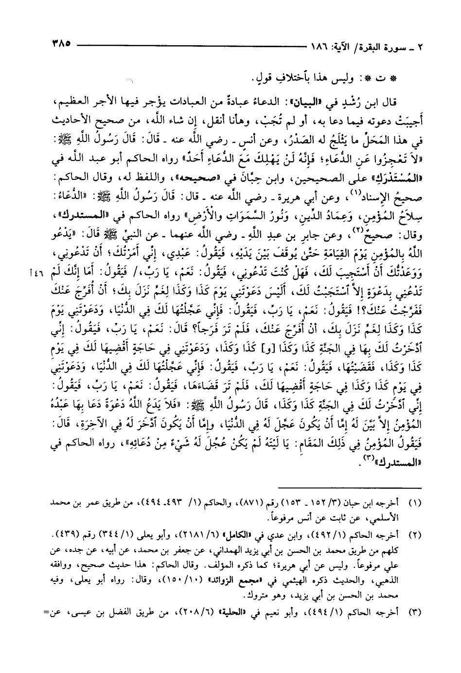 قال ابن رُشْدٍ في «البيان» : الدعاءُ عبادةٌ من العبادات يؤْجر فيها الأجر العظيم، أَجيبَتْ دعوته فيما دعا به، أو لم تُجَبْ، وهأنا أنقل، إِن شاء اللَّه، من صحيح الأحاديث في هذا المَحَلِّ ما يَثْلَجُ له الصَدْرُ، وعن أنسٍ- رضي اللَّه عنه- قَالَ: قَالَ رَسُولُ الله صلّى الله عليه وسلم:
