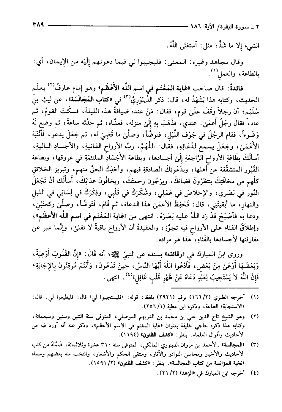 فائدةٌ: قال صاحب «غاية المَغْنَم في اسم اللَّه الأَعْظَم» وهو إِمام عارفٌ «2» بعلْمِ الحديث، وكتابه هذا يَشْهَدُ له، قال: ذكر الدِّينَوَرِيُّ «3» في «كتاب المُجَالَسَة» ، عن ليثِ بنِ سُلَيْمٍ أن رجلاً وقَفَ على قوم، فقال: مَنْ عنده ضيافةٌ هذه الليلةَ، فسكَتَ القومُ، ثم عاد، فقالَ رجُلٌ أعمى: عندي، فذَهَبَ بِهِ إلى منزله، فعشَّاه، ثم حدَّثه ساعةً، ثم وضع لهُ وَضُوءاً، فقام الرجُلُ في جَوْف اللَّيْلِ، فتوضَّأ، وصلى ما قُضِيَ له، ثم جَعَلَ يدعو، فانتبه الأعمى، وجَعَلَ يسمع لدْعَائِهِ، فقال: اللَّهُمَّ، ربَّ الأرواحِ الفانيةِ، والأجسادِ الباليةِ، أسألُكَ بطَاعَةِ الأرواحِ الرَّاجعَةِ إلى أجسادها، وبطاعةِ الأَجْسَادِ الملتئمَةِ في عروقها، وبطاعة القُبُور المتشقِّقة عن أهلها، وبدَعْوتِكَ الصادقةِ فيهم، وأخذِكَ الحقَّ منهم، وتبريز الخلائقِ كلِّهم من مخافَتِكَ ينتظرُونَ قضاءَكَ، ويرْجُون رحمتَكَ، ويخافُونَ عذابَكَ، أَسأَلُك أنْ تَجْعَلَ النُّور في بَصَري، والإِخلاصَ في عَمَلِي، وشُكْرَكَ في قَلْبِي، وذِكْرَكَ في لِسَانِي في الليلِ والنهارِ، ما أبقيتَنِي، قال: فَحَفِظَ الأعمى هذا الدعاءَ، ثم قَامَ، فَتَوضَّأ، وصلى ركعتَيْنِ، ودعا به فأصْبَحَ قدْ رَد اللَّهُ عليه بَصَرَهُ. انتهى من «غاية المَغْنَم في اسم اللَّه الأعظَم» ، وإِطلاَقُ الفناءِ على الأرواحِ فيه تجوُّز، والعقيدةُ أن الأرواح باقيةٌ لا تفنى، وإِنَّما عبر عن مفارقتها لأجسادها بالفَنَاءِ، هذا هو مراده.