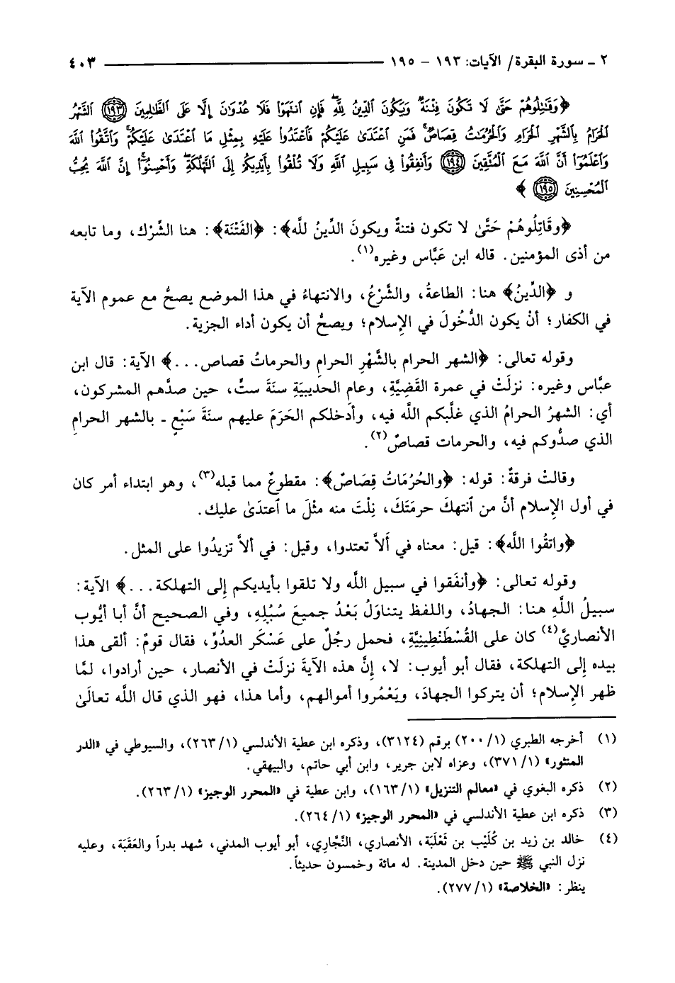 وَقاتِلُوهُمْ حَتَّى لاَ تَكُونَ فِتْنَةٌ وَيَكُونَ الدِّينُ لِلَّهِ فَإِنِ انْتَهَوْا فَلا عُدْوانَ إِلاَّ عَلَى الظَّالِمِينَ (193) الشَّهْرُ الْحَرامُ بِالشَّهْرِ الْحَرامِ وَالْحُرُماتُ قِصاصٌ فَمَنِ اعْتَدى عَلَيْكُمْ فَاعْتَدُوا عَلَيْهِ بِمِثْلِ مَا اعْتَدى عَلَيْكُمْ وَاتَّقُوا اللَّهَ وَاعْلَمُوا أَنَّ اللَّهَ مَعَ الْمُتَّقِينَ (194) وَأَنْفِقُوا فِي سَبِيلِ اللَّهِ وَلا تُلْقُوا بِأَيْدِيكُمْ إِلَى التَّهْلُكَةِ وَأَحْسِنُوا إِنَّ اللَّهَ يُحِبُّ الْمُحْسِنِينَ (195)