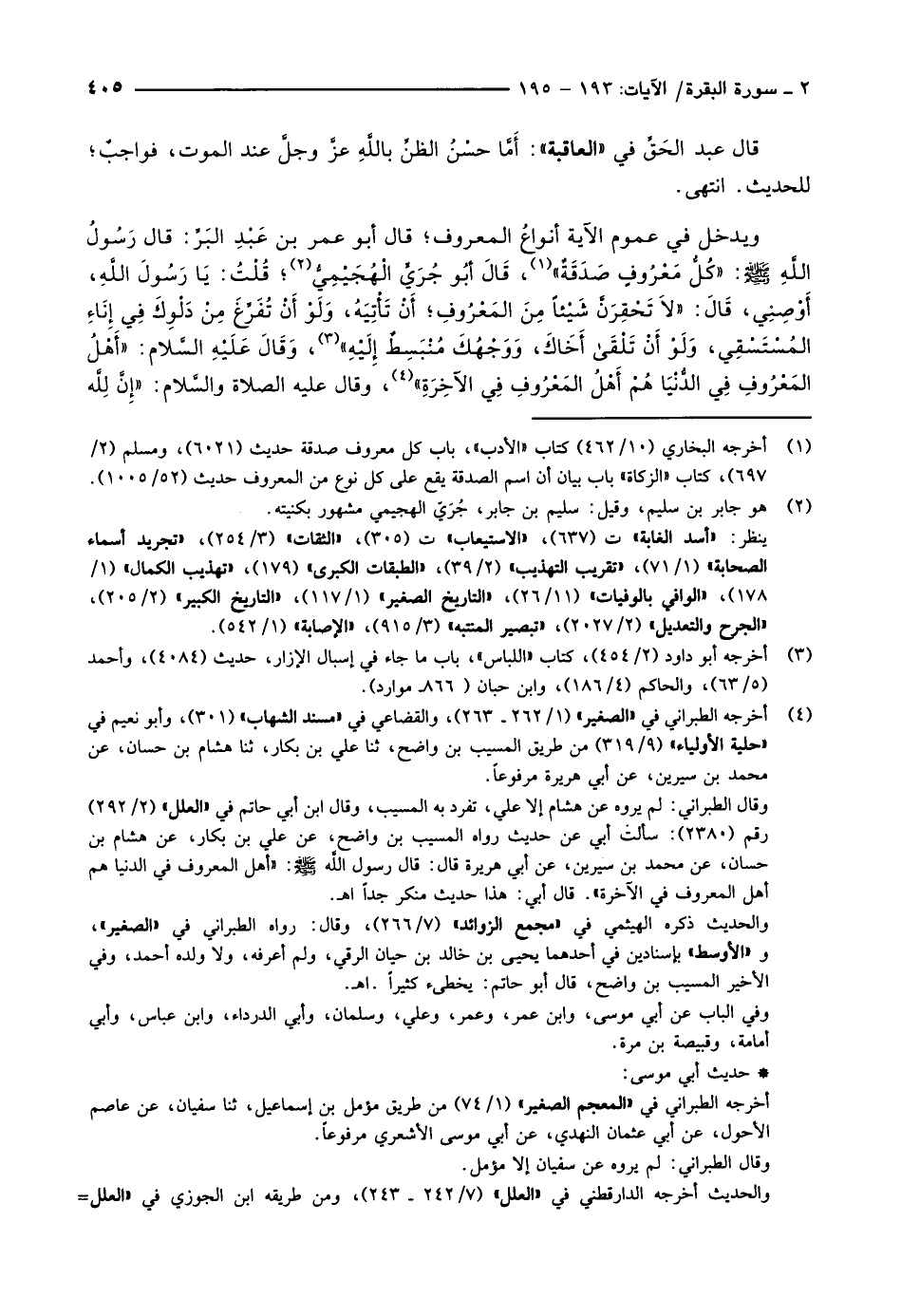 ويدخل في عموم الآية أنواعُ المعروف قال أبو عمر بن عَبْدِ البَرِّ: قال رسول الله صلّى الله عليه وسلم: «كُلُّ مَعْرُوفٍ صَدَقَةٌ» «1» ، قَالَ أبُو جُرَيٍّ الْهُجَيْمِيُّ «2» قُلْتُ: يَا رَسُولَ اللَّهِ، أَوْصِنِي، قَالَ: «لاَ تَحْقِرَنَّ شَيْئاً مِنَ المَعْرُوفِ أَنْ تَأْتِيَهُ، وَلَوْ أَنْ تُفَرِّغَ مِنْ دَلْوِكَ فِي إِنَاءِ المُسْتَسْقِي، وَلَوْ أَنْ تلقى أَخَاكَ، وَوَجْهُكَ مُنْبَسِطٌ إِلَيْهِ» «3» ، وَقَالَ عَلَيْهِ السَّلام: «أَهْلُ المَعْرُوفِ فِي الدُّنْيَا هُمْ أَهْلُ المَعْرُوفِ فِي الآخِرَةِ» «4» ، وقال عليه الصلاة والسّلام: «إنّ لله