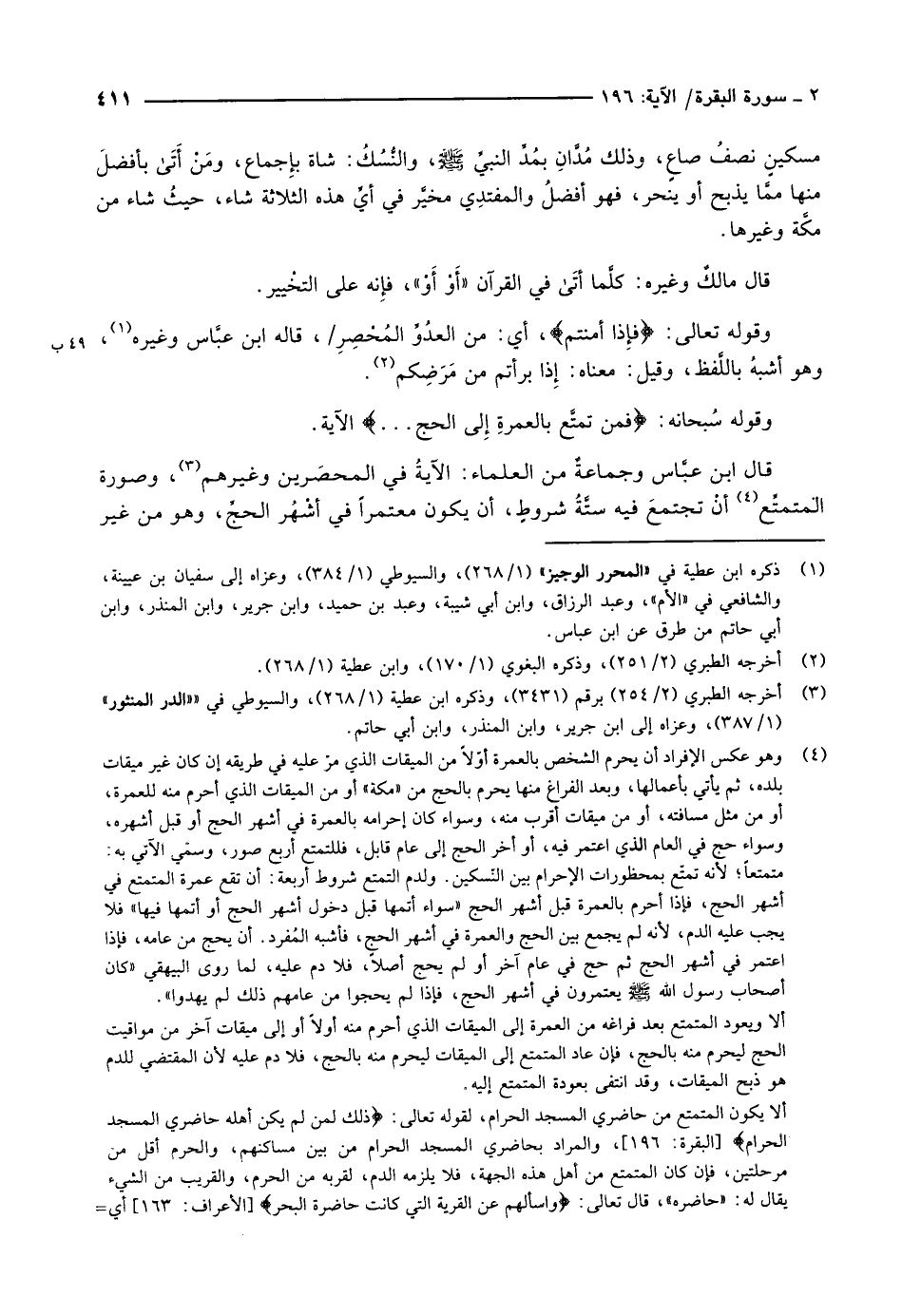 قال ابن عبَّاس وجماعةٌ من العلماء: الآيةُ في المحصَرين وغيرهم «3» ، وصورة المتمتِّع «4» أنْ تجتمعَ فيه ستَّةُ شروطٍ، أن يكون معتمراً في أشْهُر الحجِّ، وهو من غير