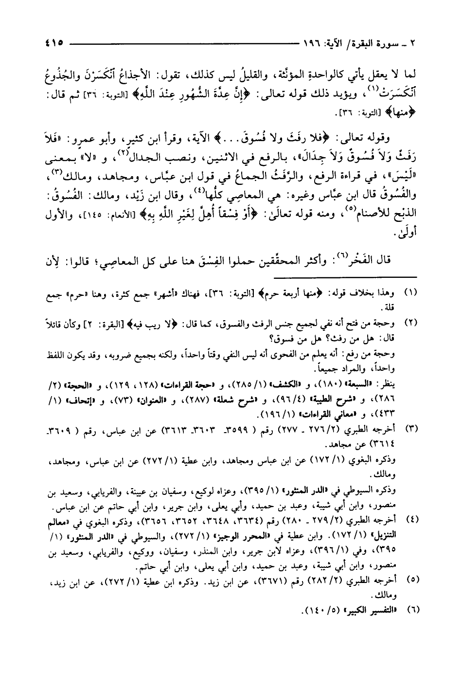 (2) وحجة من فتح أنه نفي لجميع جنس الرفث والفسوق، كما قال: لا رَيْبَ فِيهِ [البقرة: 2] وكأن قائلا قال: هل من رفث؟ هل من فسوق؟