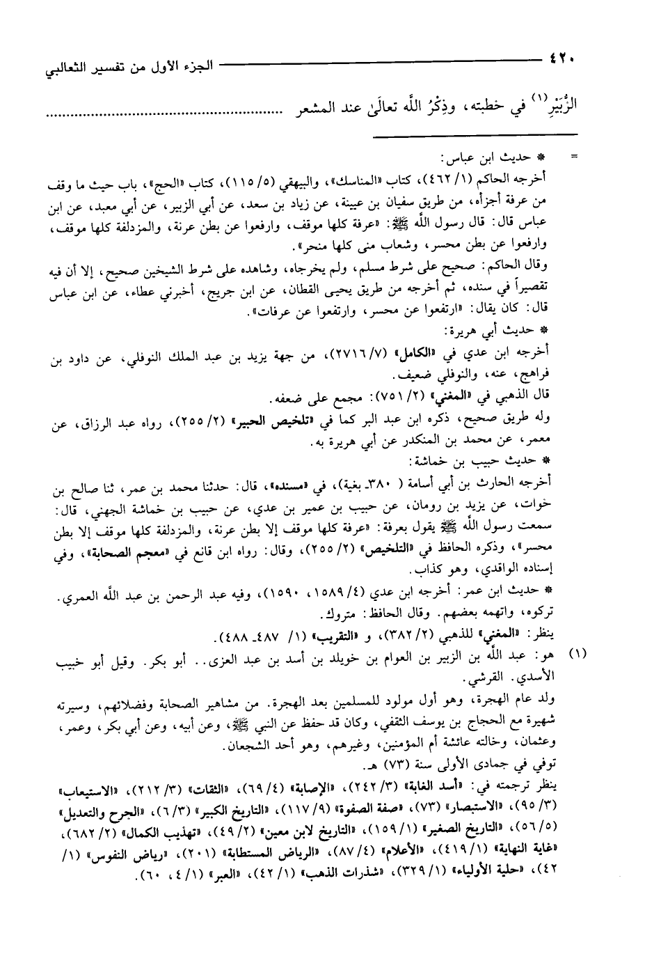 الزُّبَيْرِ «1» في خطبته، وذِكْرُ اللَّه تعالى عند المشعر