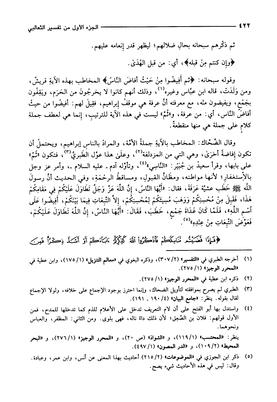 وقوله سبحانه: ثُمَّ أَفِيضُوا مِنْ حَيْثُ أَفاضَ النَّاسُ المخاطب بهذه الآيةِ قريشٌ، ومن وَلَدَتْ، قاله ابن عبَّاس وغيره «1» ، وذلك أنهم كانوا لا يخرجُونَ من الحَرَم، ويَقِفُون بجَمْعٍ، ويفيضون منْه، مع معرفته أنَّ عرفة هي موقفُ إِبراهيم، فقِيلَ لهم: أفيضُوا من حيثُ أفاضَ النَّاس، أي: من عرفة، و «ثُمَّ» ليست في هذه الآية للترتيبِ، إِنما هي لعطف جملة كلامٍ على جملة هي منها منقطعةٌ.