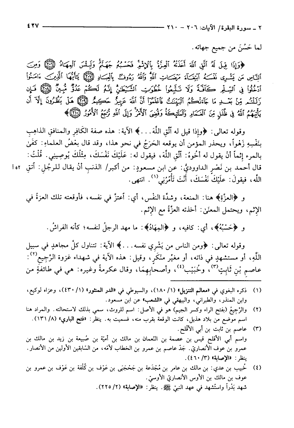 وَإِذا قِيلَ لَهُ اتَّقِ اللَّهَ أَخَذَتْهُ الْعِزَّةُ بِالْإِثْمِ فَحَسْبُهُ جَهَنَّمُ وَلَبِئْسَ الْمِهادُ (206) وَمِنَ النَّاسِ مَنْ يَشْرِي نَفْسَهُ ابْتِغاءَ مَرْضاتِ اللَّهِ وَاللَّهُ رَؤُفٌ بِالْعِبادِ (207) يا أَيُّهَا الَّذِينَ آمَنُوا ادْخُلُوا فِي السِّلْمِ كَافَّةً وَلا تَتَّبِعُوا خُطُواتِ الشَّيْطانِ إِنَّهُ لَكُمْ عَدُوٌّ مُبِينٌ (208) فَإِنْ زَلَلْتُمْ مِنْ بَعْدِ مَا جاءَتْكُمُ الْبَيِّناتُ فَاعْلَمُوا أَنَّ اللَّهَ عَزِيزٌ حَكِيمٌ (209) هَلْ يَنْظُرُونَ إِلاَّ أَنْ يَأْتِيَهُمُ اللَّهُ فِي ظُلَلٍ مِنَ الْغَمامِ وَالْمَلائِكَةُ وَقُضِيَ الْأَمْرُ وَإِلَى اللَّهِ تُرْجَعُ الْأُمُورُ (210)