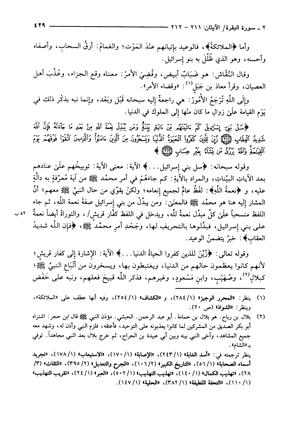 (2) بلال بن رباح. هو بلال بن حمامة. أبو عبد الرحمن. الحبشي. مؤذن النبي صلّى الله عليه وسلم قال ابن حجر: اشتراه أبو بكر الصديق من المشركين لما كانوا يعذبونه على التوحيد، فأعتقه، فلزم النبي وأذن له، وشهد معه جميع المشاهد، وآخى النبي بينه وبين أبي عبيدة بن الجراح، ثم خرج بلال بعد النبي مجاهدا. توفي ب «الشام» .