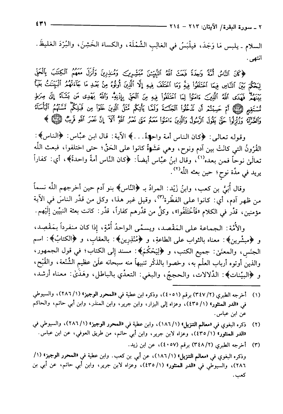 وقال أُبَيُّ بن كعب، وابنُ زَيْد: المرادُ ب النَّاسُ بنو آدم حين أخرجهم اللَّه نسماً من ظهر آدم، أي: كانوا على الفطْرة «3» ، وقيل غير هذا، وكل من قدَّر الناسَ في الآية مؤمنين، قدَّر في الكلام «فاختلفوا» ، وكلُّ من قدَّرهم كفاراً، قدَّر: كانت بعثة النبيِّين إِلَيْهم.