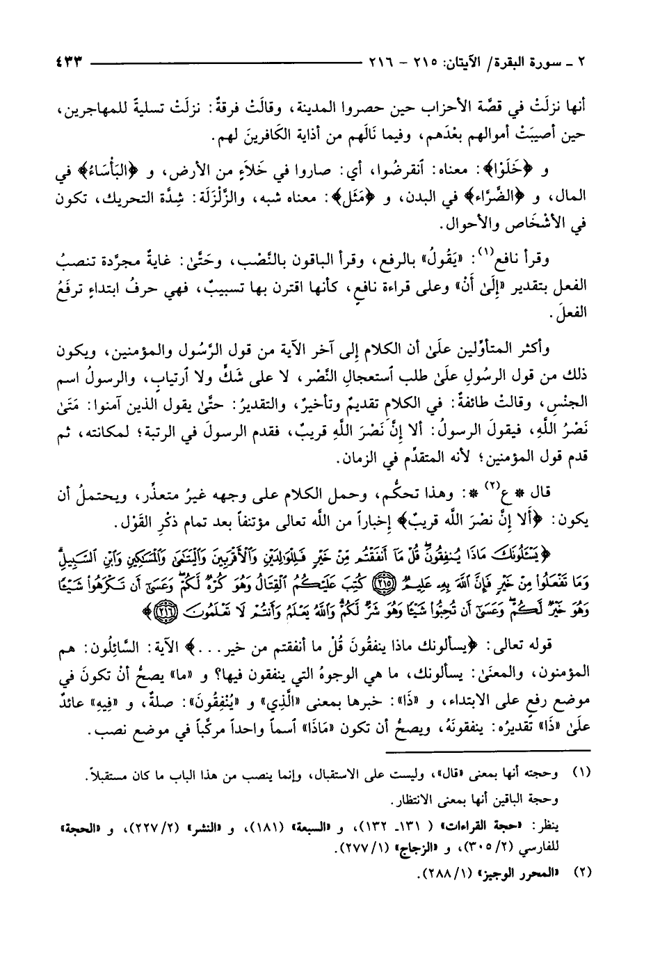 يَسْئَلُونَكَ مَاذَا يُنْفِقُونَ قُلْ مَآ أَنْفَقْتُمْ مِنْ خَيْرٍ فَلِلْوالِدَيْنِ وَالْأَقْرَبِينَ وَالْيَتامى وَالْمَساكِينِ وَابْنِ السَّبِيلِ وَما تَفْعَلُوا مِنْ خَيْرٍ فَإِنَّ اللَّهَ بِهِ عَلِيمٌ (215) كُتِبَ عَلَيْكُمُ الْقِتالُ وَهُوَ كُرْهٌ لَكُمْ وَعَسى أَنْ تَكْرَهُوا شَيْئاً وَهُوَ خَيْرٌ لَكُمْ وَعَسى أَنْ تُحِبُّوا شَيْئاً وَهُوَ شَرٌّ لَكُمْ وَاللَّهُ يَعْلَمُ وَأَنْتُمْ لا تَعْلَمُونَ (216)