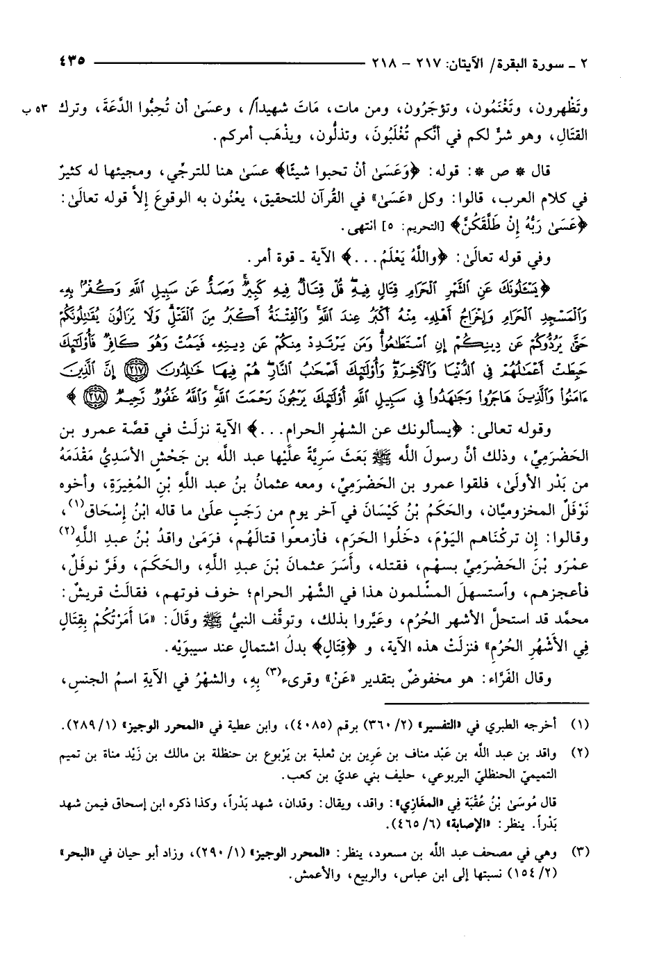 وقوله تعالى: يَسْئَلُونَكَ عَنِ الشَّهْرِ الْحَرامِ ... الآية نزلَتْ في قصَّة عمرو بن الحَضْرَمِيِّ، وذلك أنّ رسول الله صلّى الله عليه وسلم بَعَثَ سَرِيَّةً علَيْها عبد اللَّه بن جَحْشٍ الأسَدِيُّ مَقْدَمَهُ من بَدْر الأولى، فلقوا عمرو بن الحَضْرَمِيِّ، ومعه عثمانُ بنُ عبد اللَّهِ بْنِ المُغِيرَةِ، وأخوه نَوْفَلٌ المخزوميَّان، والحَكَمُ بْنُ كَيْسَانَ في آخر يومٍ من رَجَبٍ على ما قاله ابْنُ إِسْحَاق «1»