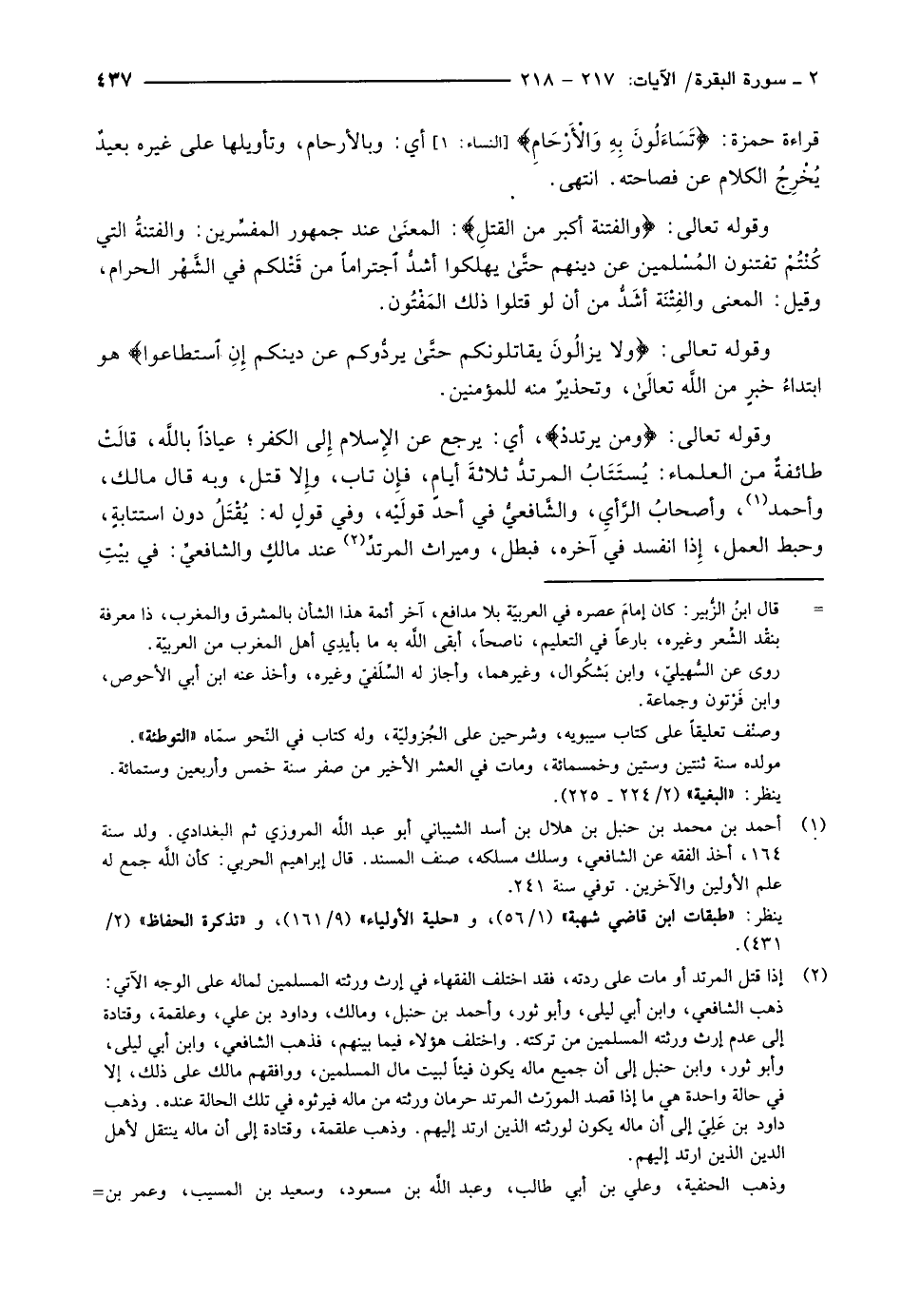وقوله تعالى: وَلا يَزالُونَ يُقاتِلُونَكُمْ حَتَّى يَرُدُّوكُمْ عَنْ دِينِكُمْ إِنِ اسْتَطاعُوا هو ابتداءُ خبرٍ من اللَّه تعالى، وتحذيرٌ منه للمؤمنين.