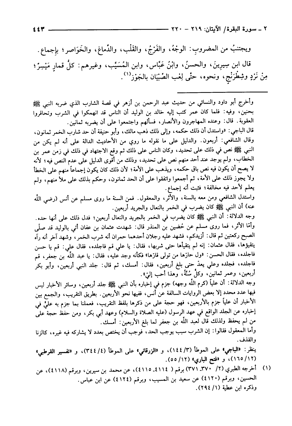 قال الباجي: «واستدل أن ذلك حكمه، وإلى ذلك ذهب مالك، وأبو حنيفة أن حد شارب الخمر ثمانون، وقال الشافعي: أربعون. والدليل على ما نقوله ما روي من الأحاديث الدالة على أنه لم يكن من النبي صلّى الله عليه وسلم نص في ذلك على تحديد، وكان الناس على ذلك ثم وقع الاجتهاد في ذلك في زمن عمر بن الخطاب، ولم يوجد عند أحد منهم نص على تحديد، وذلك من أقوى الدليل على عدم النص فيه لأنه لا يصح أن يكون فيه نص باق حكمه، ويذهب على الأمة لأن ذلك كان يكون إجماعا منهم على الخطأ ولا يجوز ذلك على الأمة، ثم أجمعوا واتفقوا على أن الحد ثمانون، وحكم بذلك على ملأ منهم، ولم يعلم لأحد فيه مخالفة فثبت أنه إجماع.